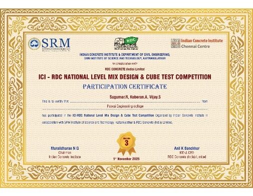 | 5 | Mr.P.Vignesh | Compressive Strength Test on Concrete Cubes | Selva Vinayaka Ready Mix, Vallipuram, Namakkal | 0.010 | 1 |