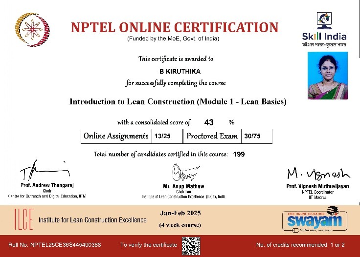| 11 | Kiruthika B | Assistant Professor | Introduction to Lean Construction(Module 1 – Lean Basics) | Completed |