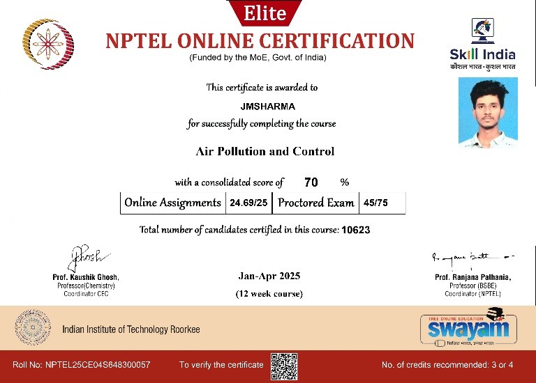 | 9. | J M Sharma | IV/ Civil | ELITE | Jan-Apr 2025 (12 Weeks course) | View |