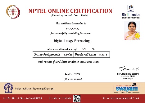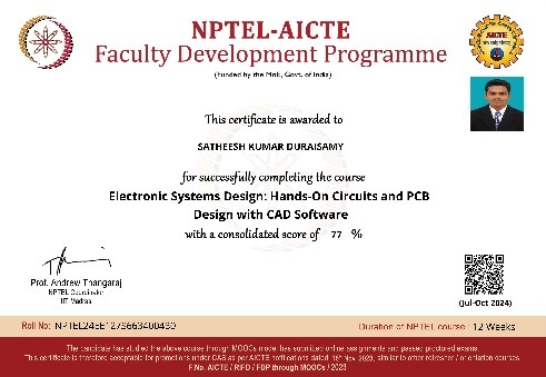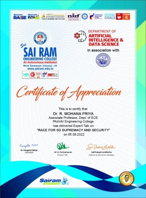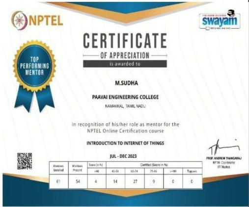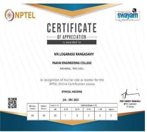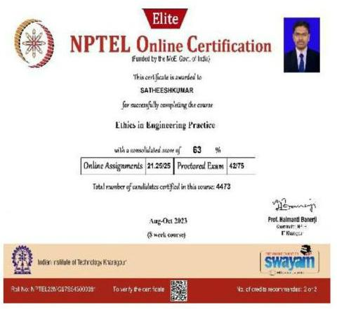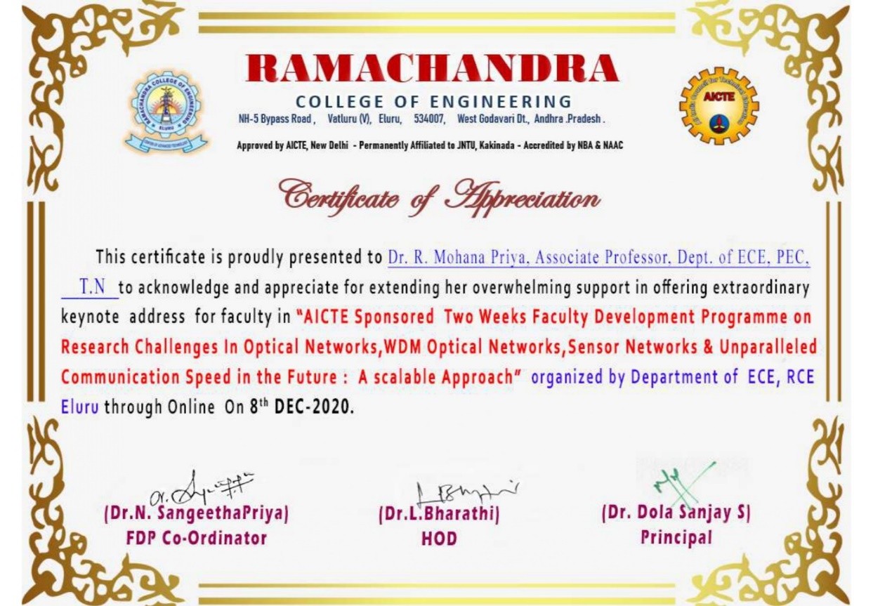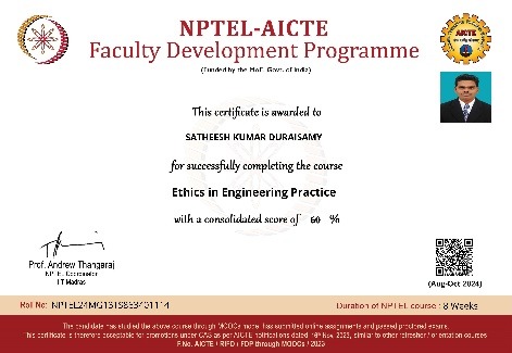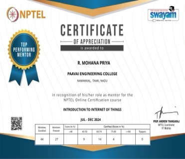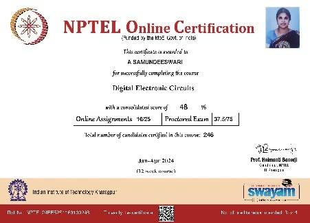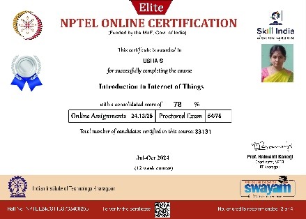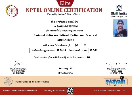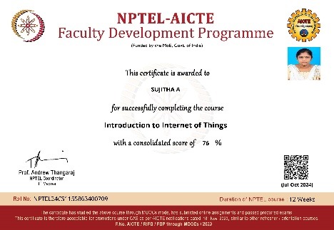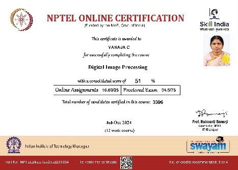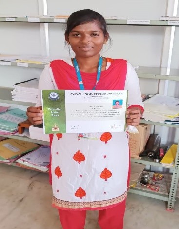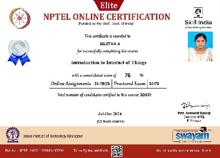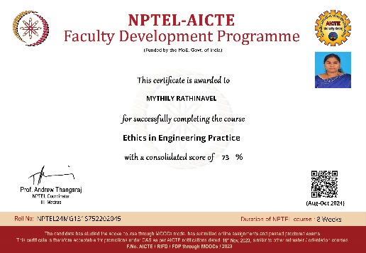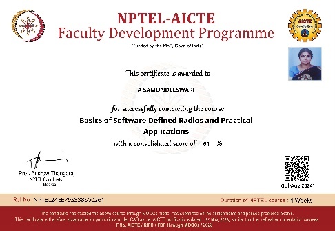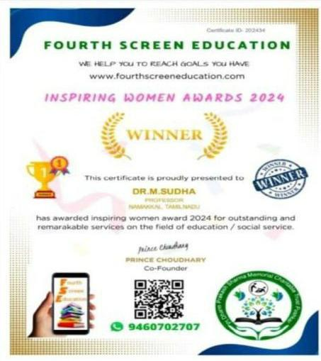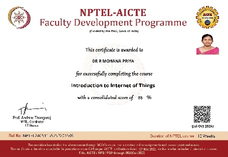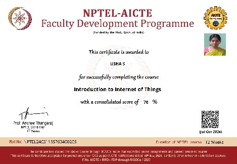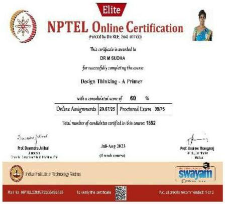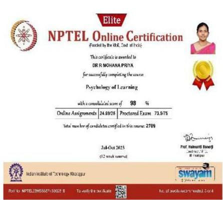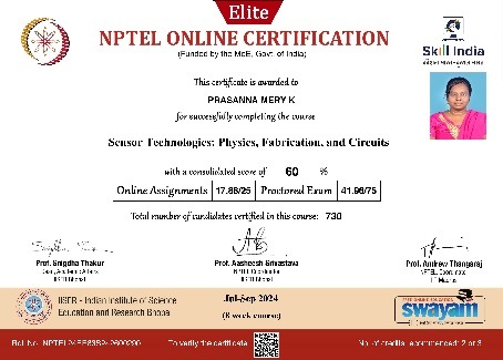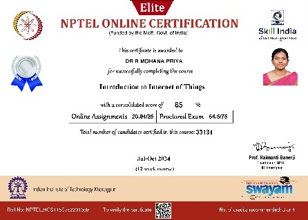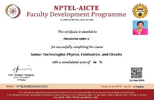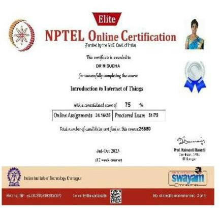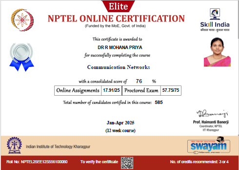She has completed the Business English Certificate (BEC) at both the Vantage and Preliminary levels from the University of Cambridge, ESOL Examinations. She is a Certified Behaviour Mentoring Analyst and has earned numerous certifications from NPTEL,IIT Bombay, Coursera, Simplilearn in areas such as Training and Development, Leadership and Team Effectiveness, NBA Accreditation and Teaching and learning in Engineering (NATE),Communication Systems. Her achievements include receiving the AICTE Lilavati Award 2022, the Young Scientist Award 2020, and several academic and sports accolades. Lifetime member of professional bodies such as ISTE ,IAENG and IFERP.