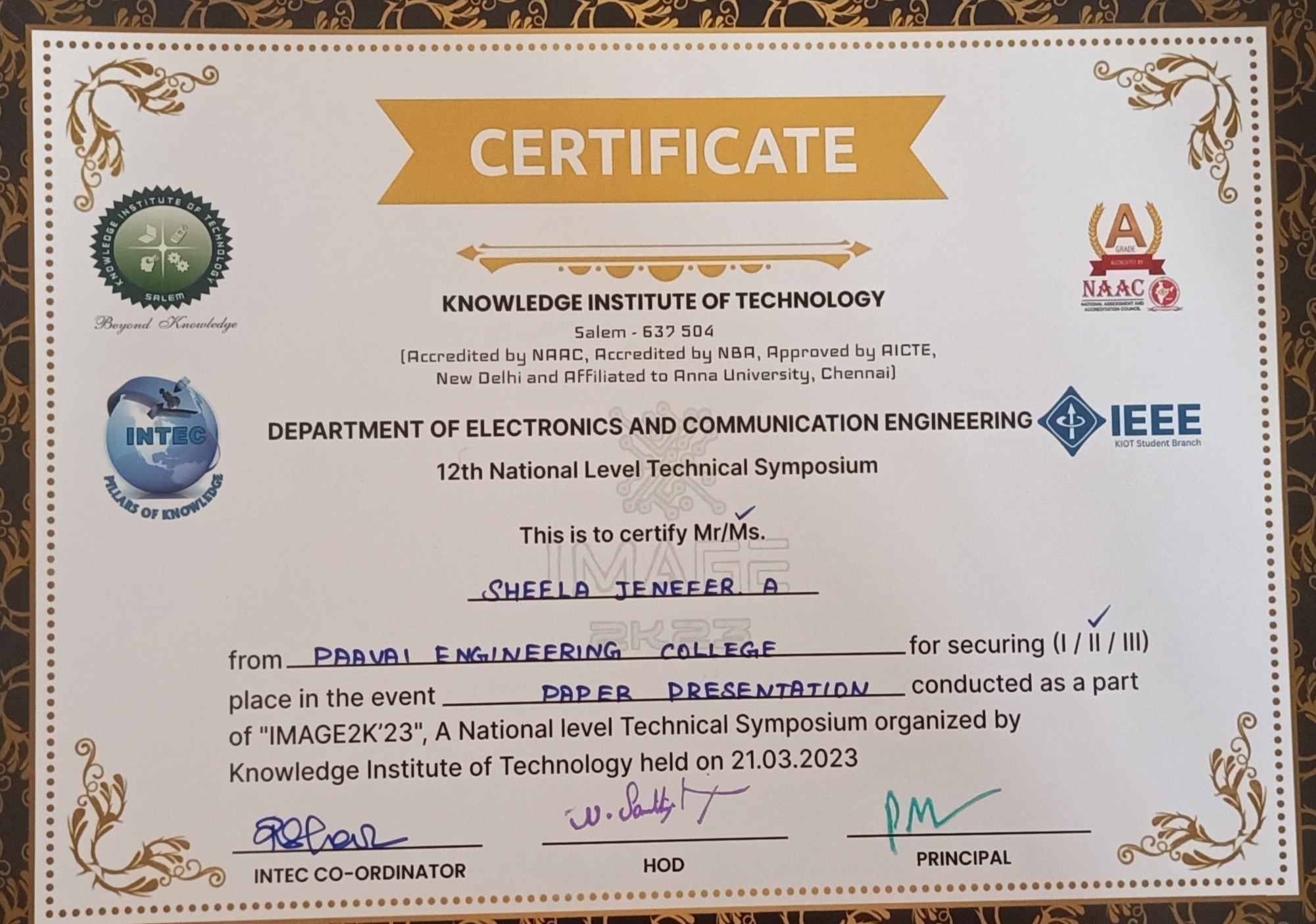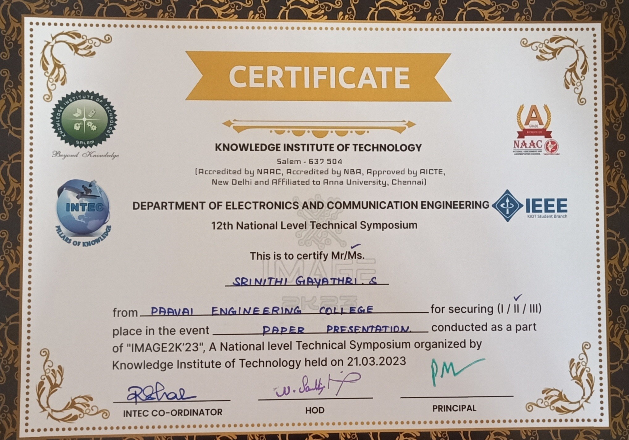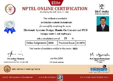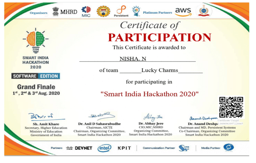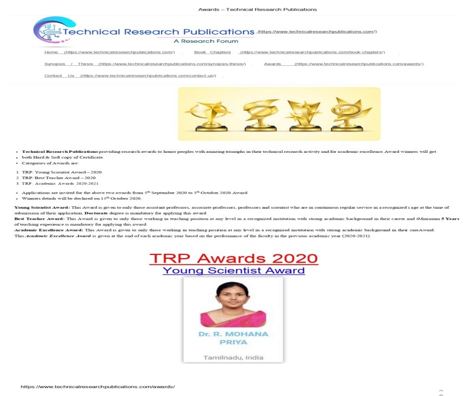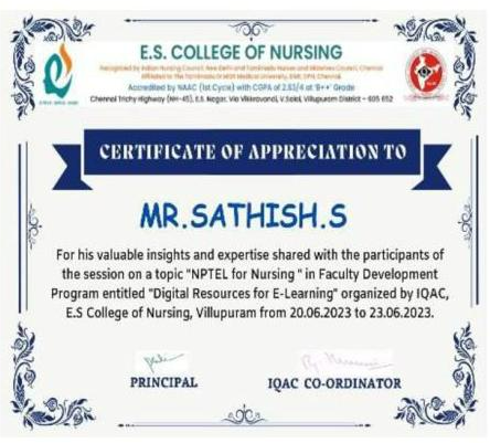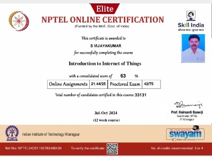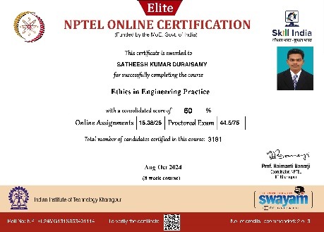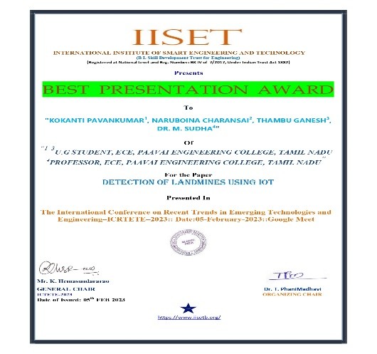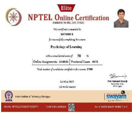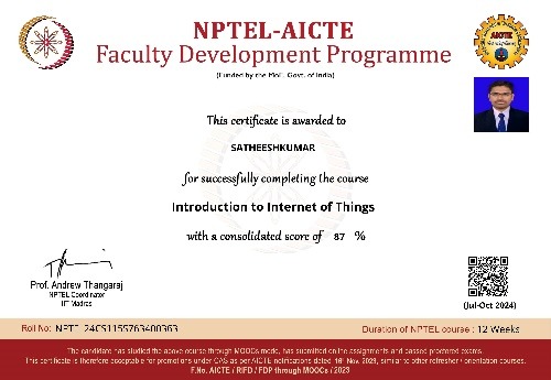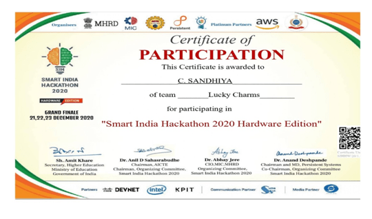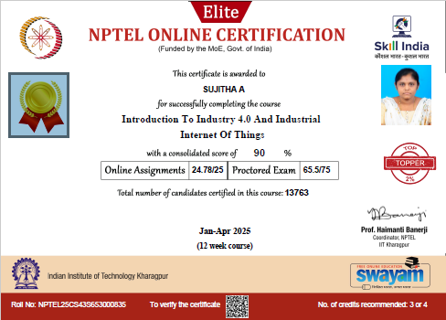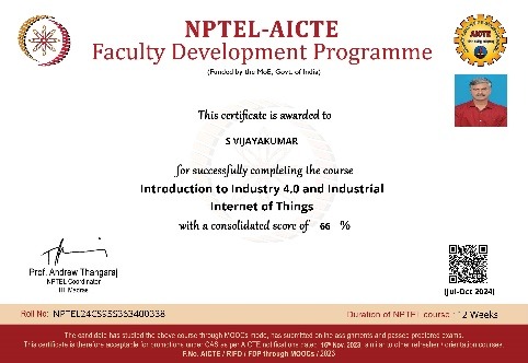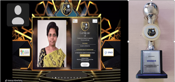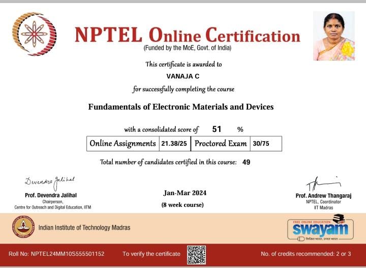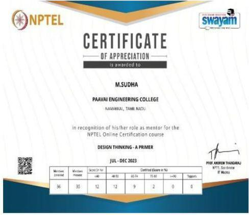 She has completed the Business English Certificate (BEC) at both the Vantage and Preliminary levels from the University of Cambridge, ESOL Examinations. She is a Certified Behaviour Mentoring Analyst and has earned numerous certifications from NPTEL,IIT Bombay, Coursera, Simplilearn in areas such as Training and Development, Leadership and Team Effectiveness, NBA Accreditation and Teaching and learning in Engineering (NATE),Communication Systems. Her achievements include receiving the AICTE Lilavati Award 2022, the Young Scientist Award 2020, and several academic and sports accolades. Lifetime member of professional bodies such as ISTE ,IAENG and IFERP.