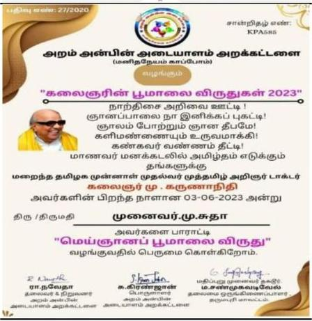 | 5 | A.Samundeeswari | Uniso, Salem | Non-government | 10,500.000 | 1 year |