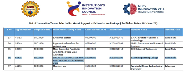 | 3 | Dr.T.Aruna S.Vijayakumar S.Satheesh Kumar | Sigma Pi Power Sources Pvt Ltd | Non-government | Rs.9,55,000/- | 3 Years |