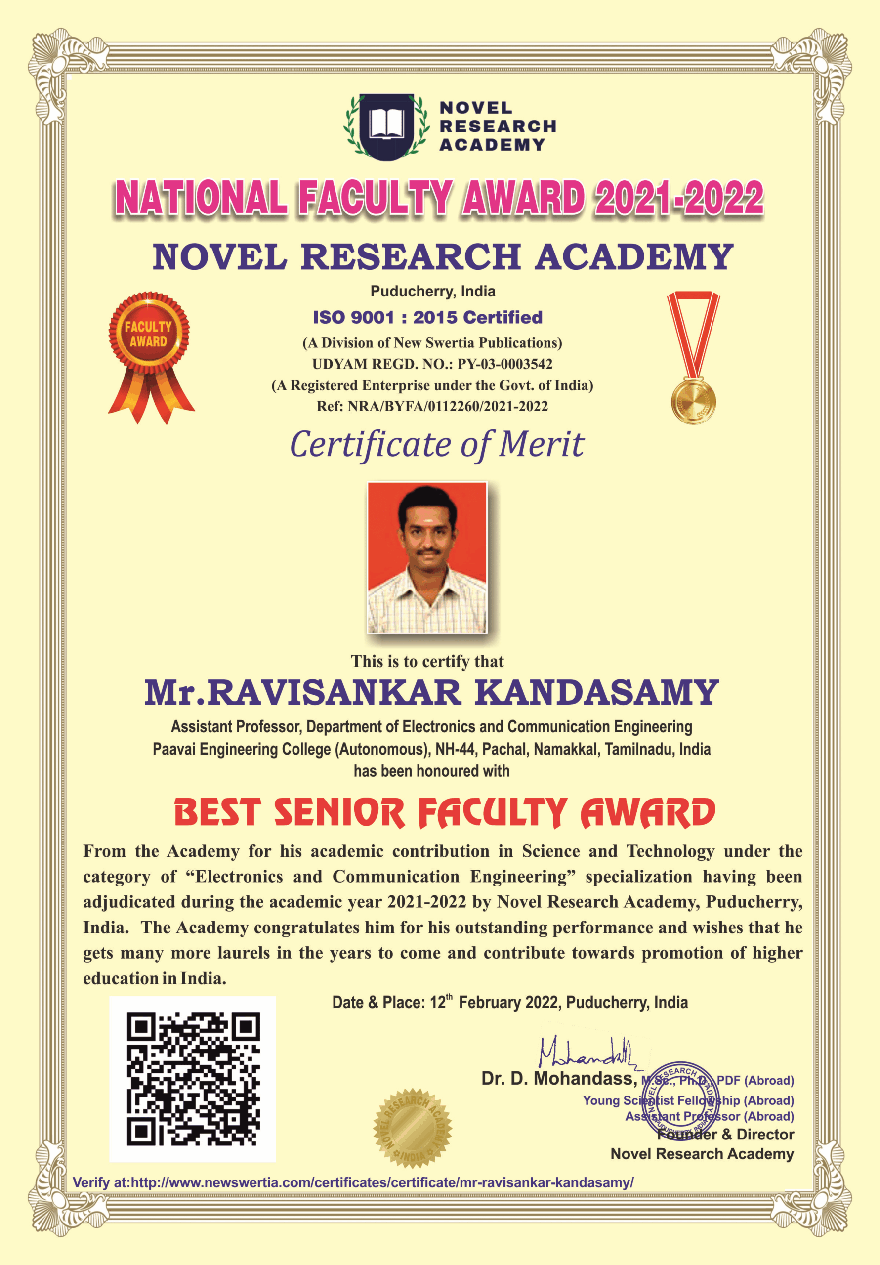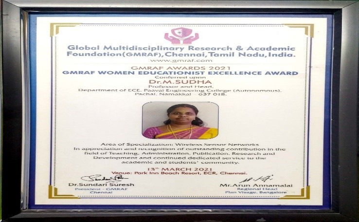She holds a Ph.D. in Wireless Networks from Anna University, Chennai, and has also earned an MBA in Human Resources from Periyar University. Additionally, she graduated as a Gold Medalist with an M.E. in Applied Electronics. In 2008, she completed her B.E. in Electronics and Communication Engineering, where she was a university topper. With over 13 years of experience as an Associate Professor at Paavai Engineering College, her research interests include Wireless Networks, Wireless Communication, and Signal Processing. She is actively involved in teaching subjects such as Signals and Systems, Wireless Communication and Networks and electronics core related courses. Additionally, she serves as the Institution’s Innovation Council Convener, Innovation Ambassador, and ATAL School Coordinator, among other roles.