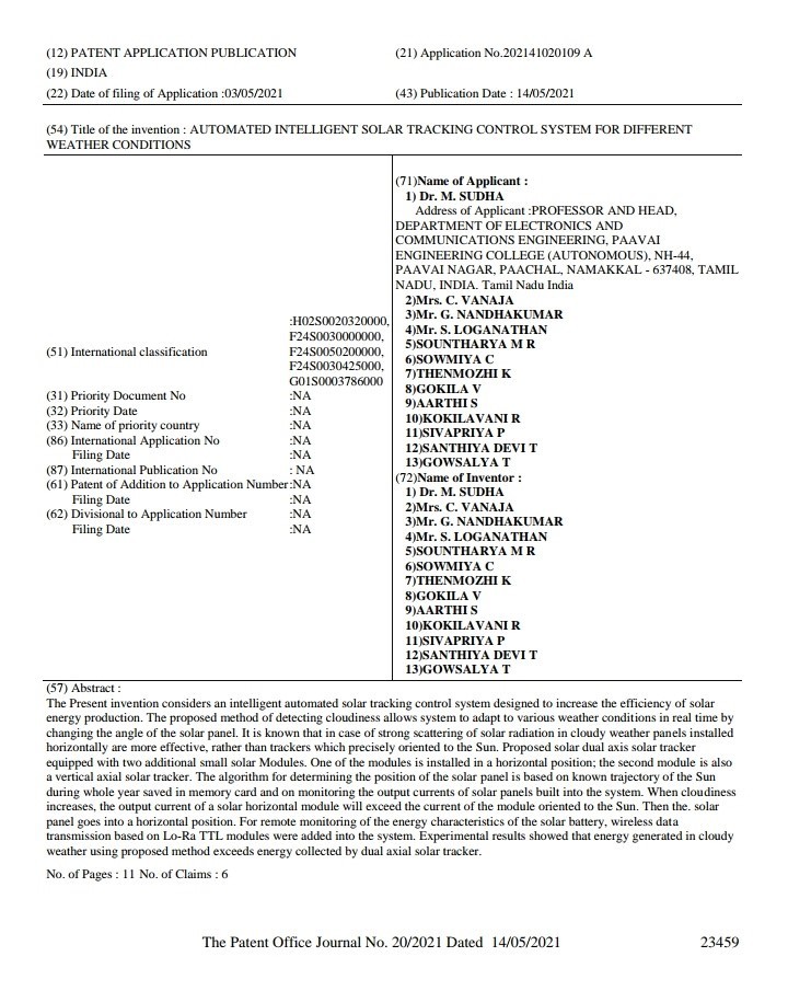 | 2 | Dr.M.Sudha, HOD, ECE Mrs.C.Vanaja, ASP, ECE Mr.G.Nandhakumar, AP,ECE Mr.S.Loganathan, AP,ECE | 202141020109A | Automated Intelligent Solar Tracking Control System for Different Weather Conditions | Published | 2021 | Link |