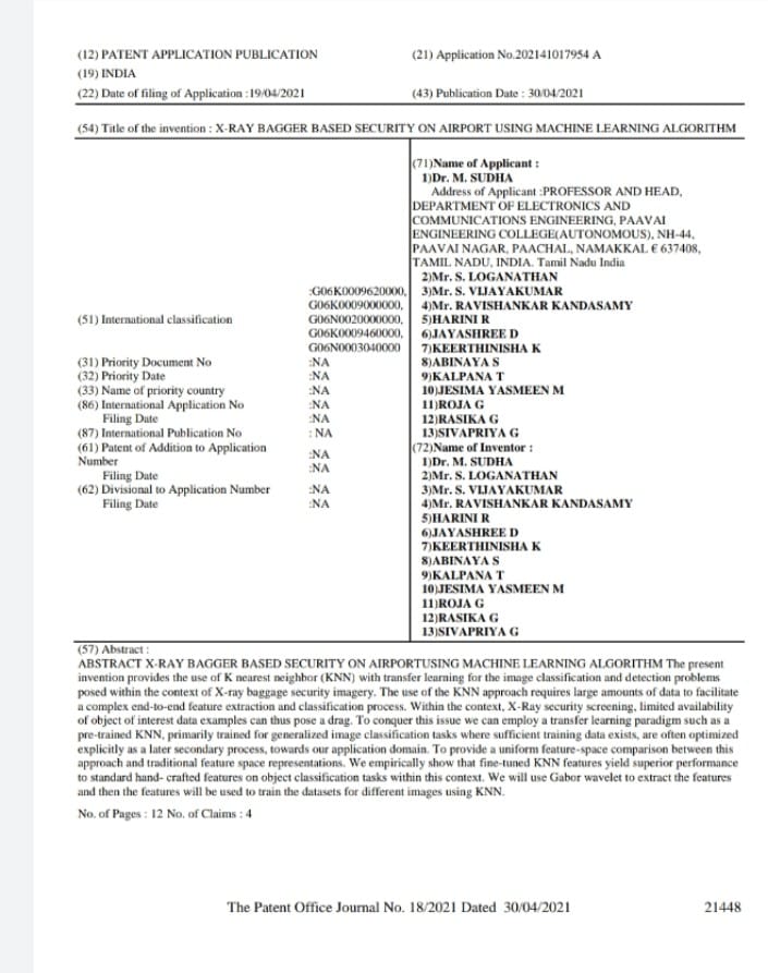 | 3 | Dr.M.Sudha, HOD, ECE Mr.S.Loganathan, AP,ECE Mr.S.Vijayakumar,ASP,ECE Mr.Ravishankar Kandhasamy, AP,ECE | 202141017954A | X-RAY Bagger Based Security on Airport Using Machine Learning Algorithm | Published | 2021 | Link |