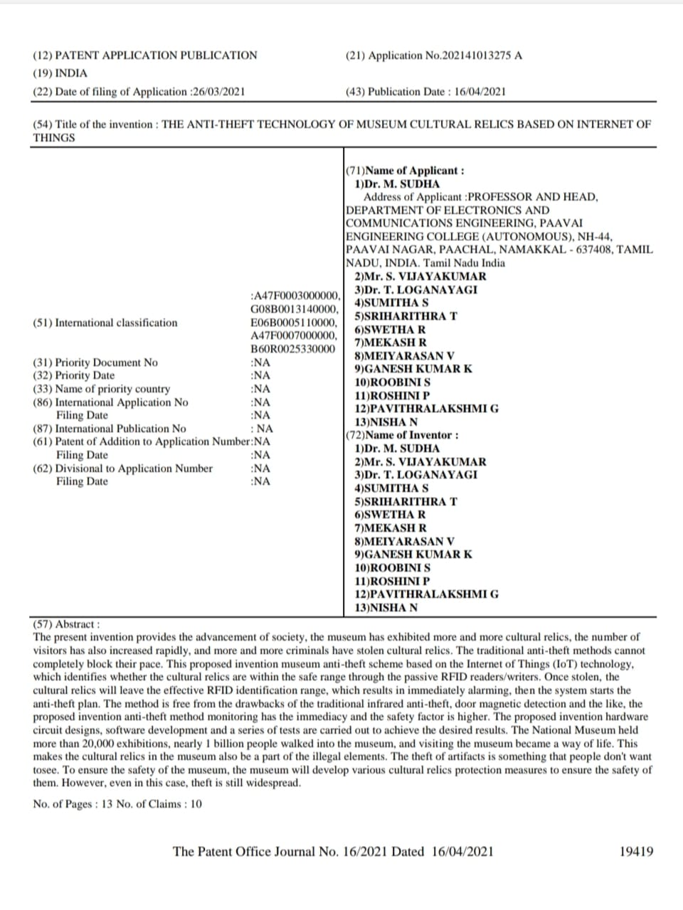 | 4 | Dr.M.Sudha, HOD, ECE Mr.S.Vijayakumar, ASP,ECE Dr.T.Loganayagi, Professor, ECE | 202141013275A | The Anti-Theft Technology of Museum Cultural Relics Based on Internet of Things | Published | 2021 | Link |