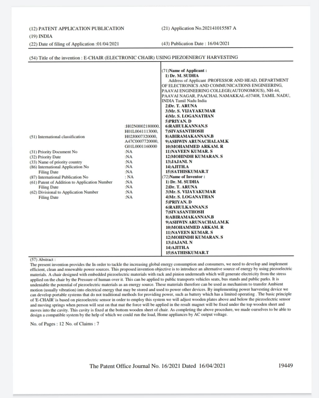| 5 | Dr.M.Sudha, HOD, ECE Dr.T.Aruna, Prefessor, ECE Mr.S.Vijayakumar, ASP,ECE Mr.S.Loganathan, AP,ECE | 202141015587A | E-Chair (Electronic Chair) Using Piezoenergy Harvesting | Published | 2021 | Link |
