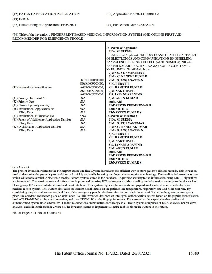 | 6 | Dr.M.Sudha, HOD, ECE Mr.S.Vijayakumar, ASP,ECE Mr.G.Nandhakumar, AP,ECE Mr.S.Loganathan, AP,ECE | 202141010843A | Fingerprint Based Medical Information System and Online First Aid Recommender For Emergency People | Published | 2021 | Link |