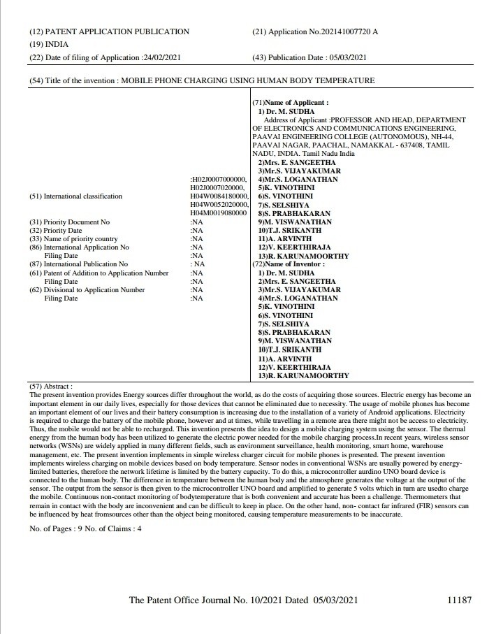 | 7 | Dr.M.Sudha, HOD, ECE Mrs.E.Sangeetha, ASP, ECE Mr.S.Vijayakumar, ASP,ECE Mr.S.Loganathan, AP,ECE | 202141007720A | Mobile Phone Charging Using Human Body Temperature | Published | 2021 | Link |