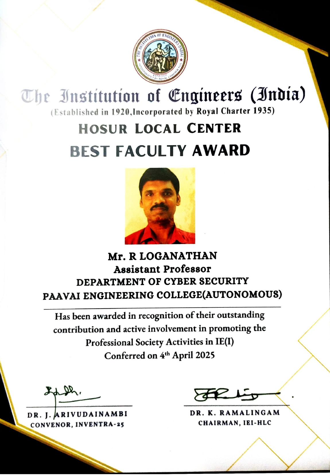 | 1 | Loganathan R | The Institutions of Engineers India | Best Faculty Award | View |