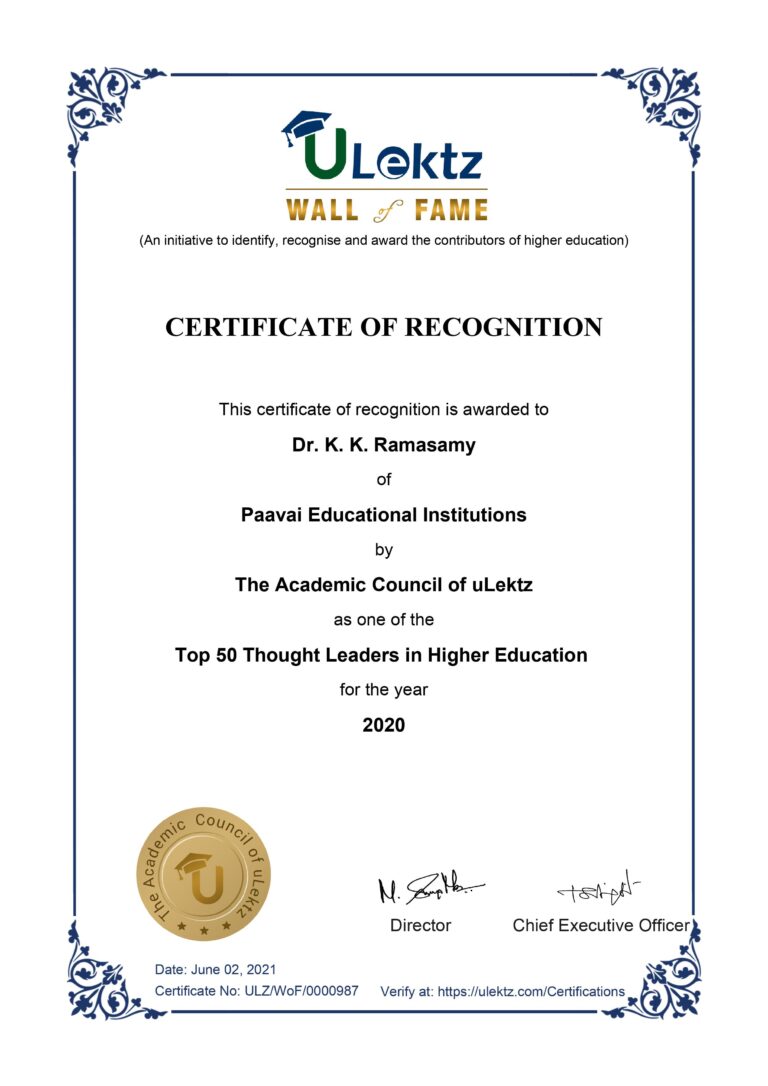 Dr K K Ramasamy, Director Admin,Paavai Institution awarded as “Top 50 Thought Leaders in Higher Education ” for the year 2020 by the Academic Council of uLektz.