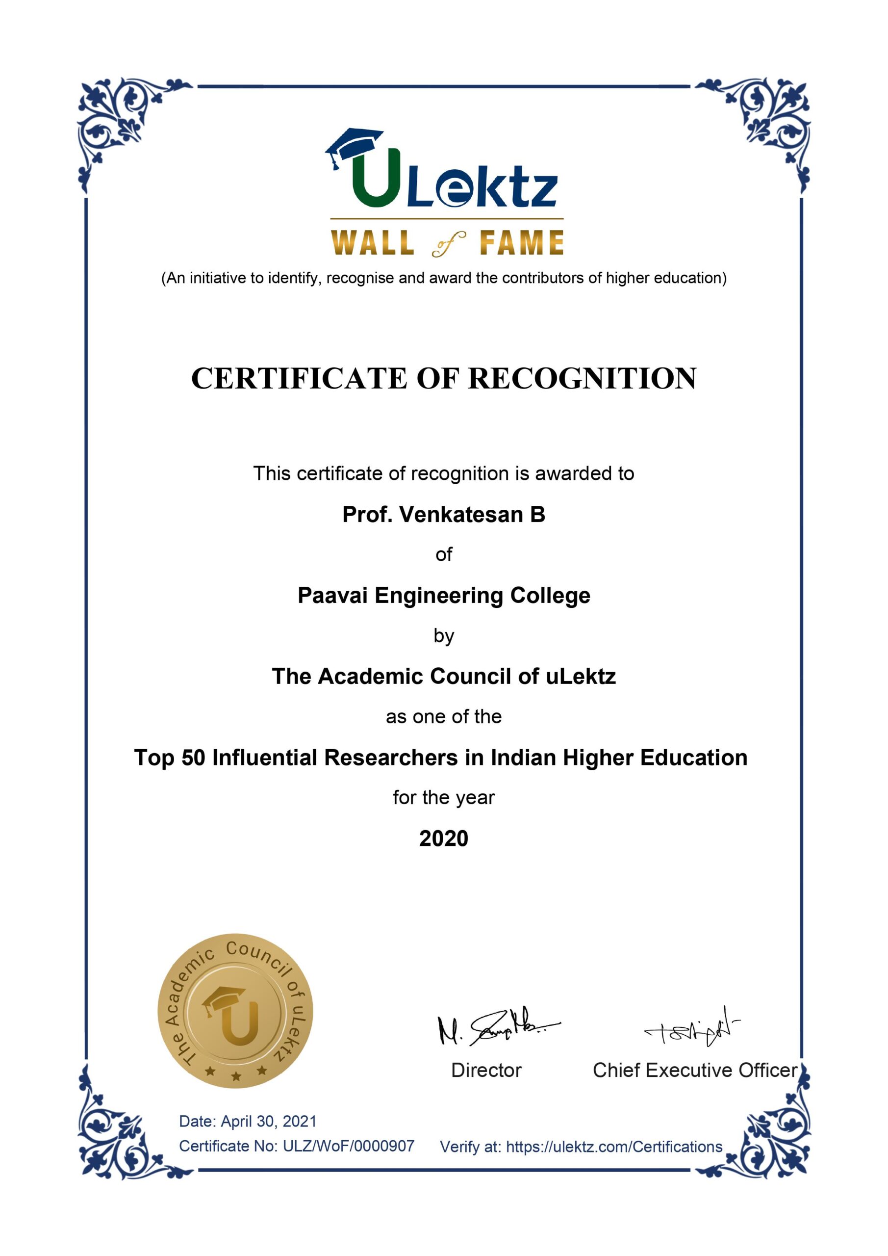 B Venkatesan,HoD/IT awarded as “one of the Top 50 Influential Researchers in Indian Higher Education” for the year 2020 by Ulektz Education Solution Ltd.