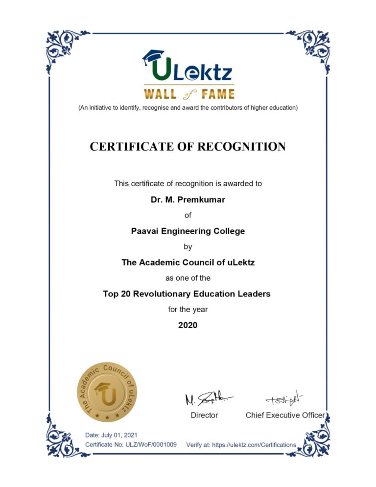 Dr M Premkumar, Principal, Paavai Engineering College awarded as ”Top 20 Revolutionary Education Leaders” for the year 2020 by The Academic Council of uLektz.