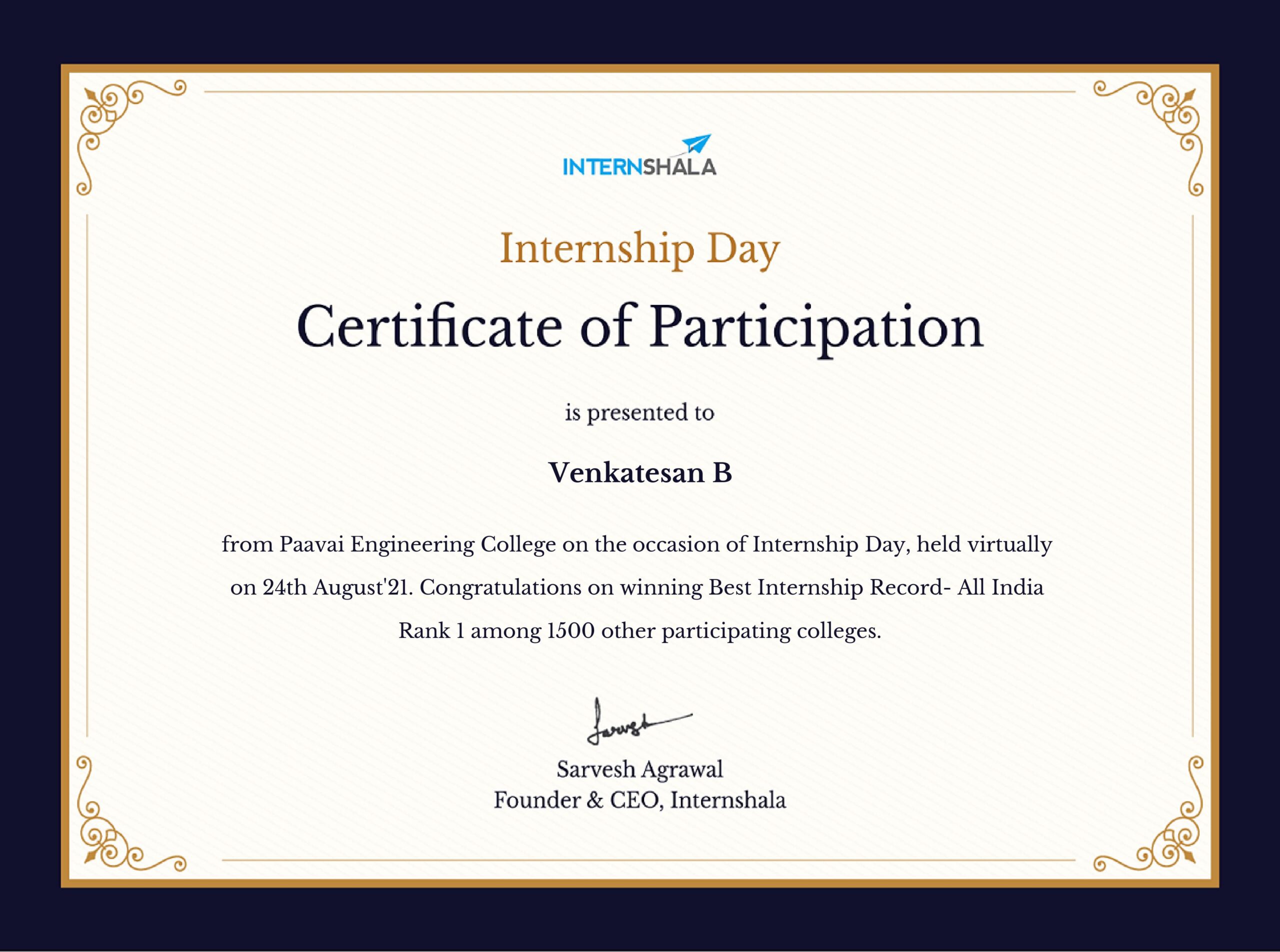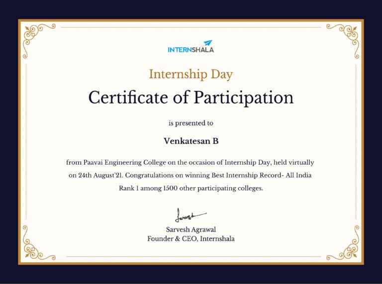 Paavai Engineering College is awarded with the Best Internship Record(All India)- 1st Position, on the occasion of Internship Day held on 24.08.2021.Internshala Founder Servesh Agarwal apprciated the effort of Prof B.venkatesan, in helping 2694 students find summer internships through Internshala from April to July 2021.