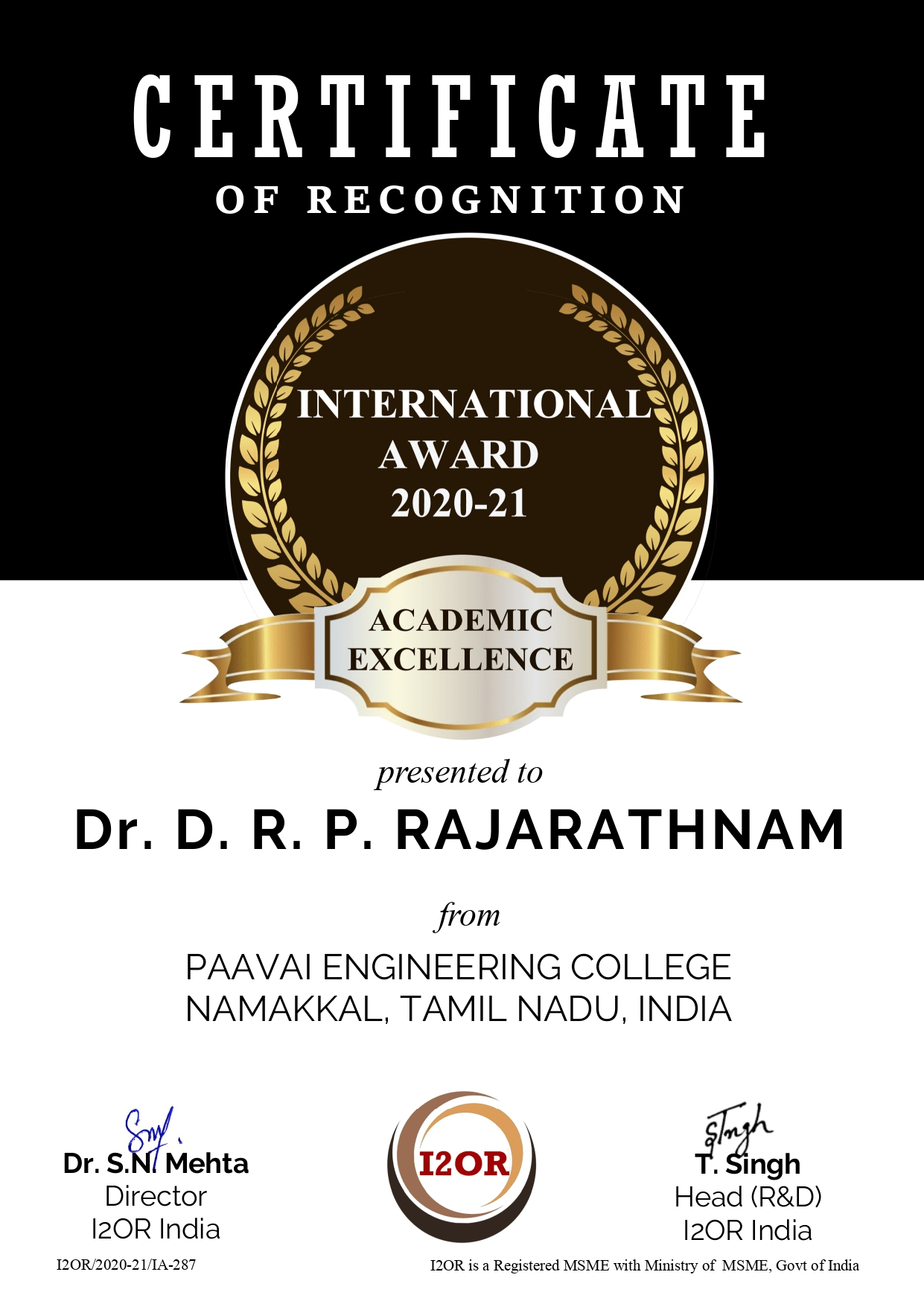 Dr.D.R.P.Rajarathnam has received “Academic Excellence Award” from Institute of Organized Research (I2OR), Cahndigarh(UT)-160036 India.