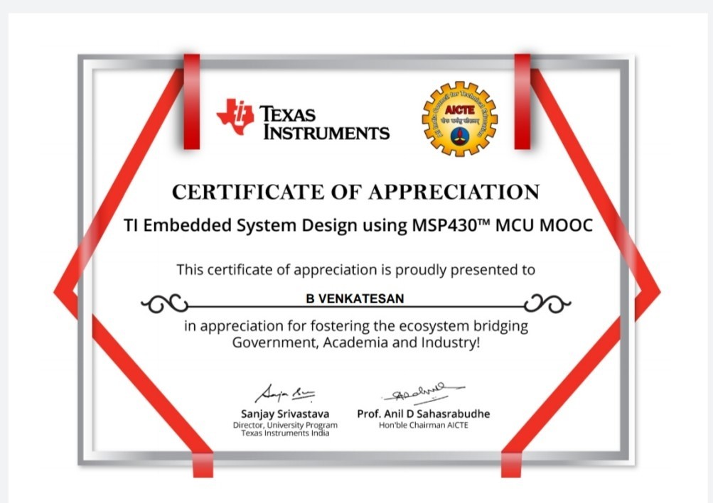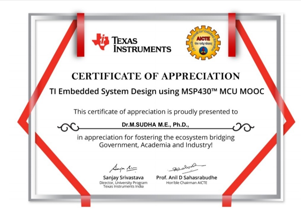 Prof B Venkatesan, HoD/IT and Dr M.Sudha ,HoD/ECE , Paavai Engineering College have been appreciated by Prof. Anil D. Sahasrabudhe, Chairman, AICTE and Mr. Sanjay Srivastava, Director University Program, Texas Instruments India, for fostering the ecosystem bridging government, academia and industry. They have been commended for achieving huge success on first chapter of introduction to embedded system design course on SWAYAM platform – ‘TI Embedded System Design using MSP43TM MLU MOOC’. The course has been endorsed by the Govt. of India and AICTE.
