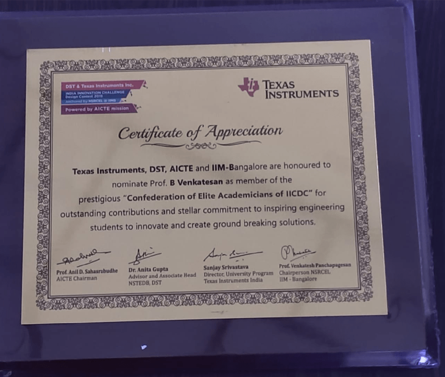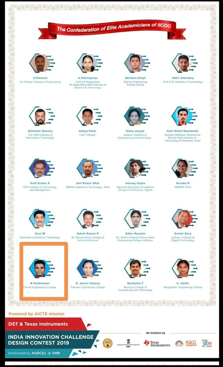 B.Venkatesan, HoD/IT is honoured and nominate as member of the prestigious ”Confederation of Elite Academicians of IICDC” by Texas Instruments, DST, AICTE and IIM-B for outstanding contributions and stellar commitment to inspiring engineering students to innovate and create ground breaking solutions and he has been selected as one of the top 200 faculty mentors all over India.