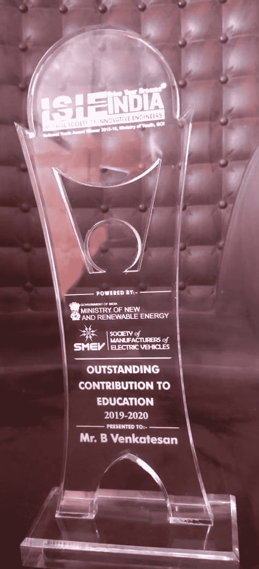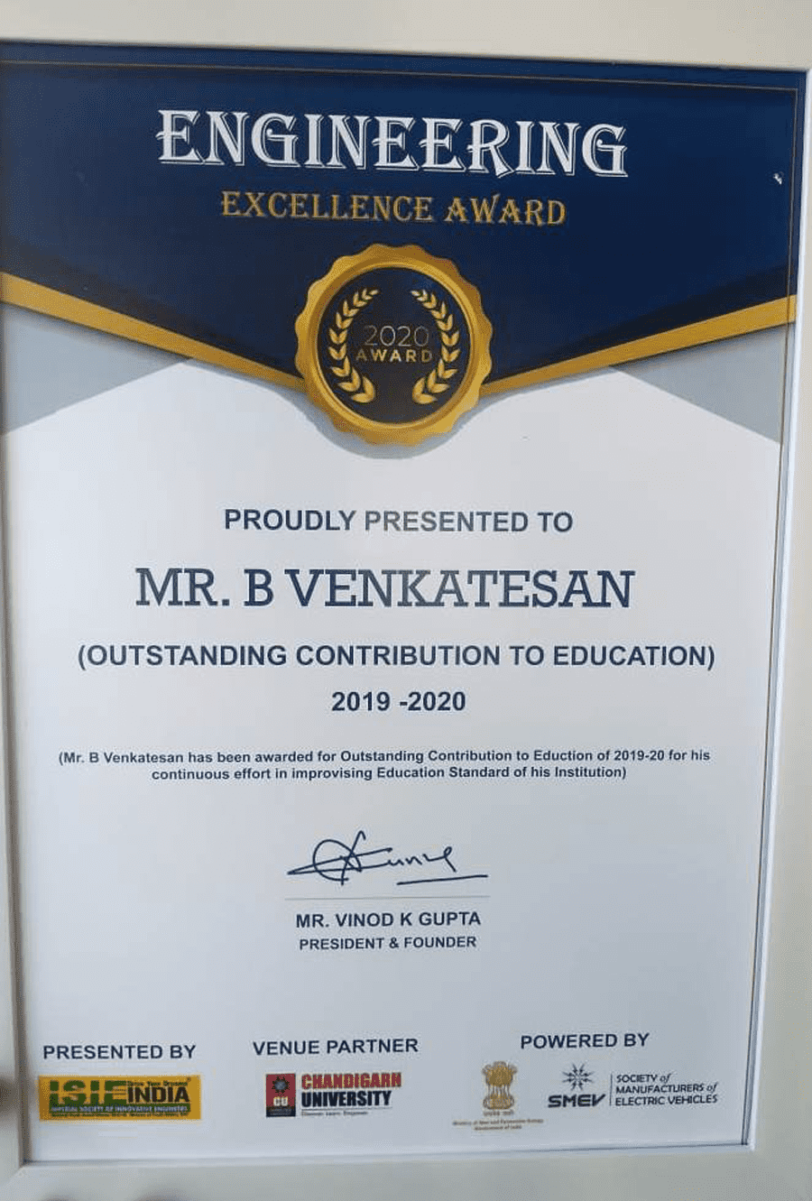B Venkatesan,HoD/IT has been awarded for “Outstanding Contribution to Education 2019-2020 “ for his continuous effort in improving Education Standard of his Institution from Imperial Society of Innovative Engineers(ISIEINDIA)