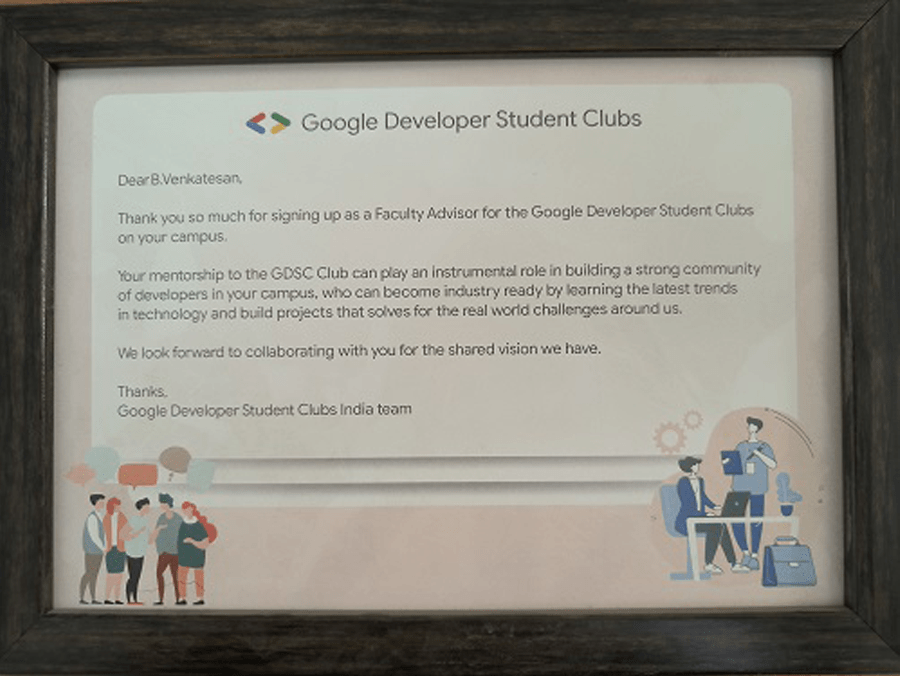 Dr. B. Venkatesan was recognized as the Faculty Advisor for Paavai-GDSC for the year 2022-2023 by the Google Developer Student Club.