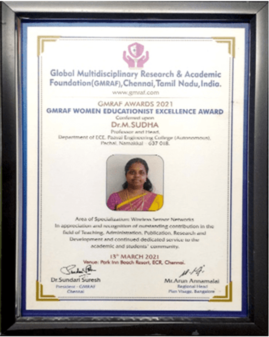M.Sudha, Professor & Head, ECE has received “GMRAF WOMEN EDUCATIONIST EXCELLENCE AWARD” for outstanding contribution in the field of teaching, Administration, Research and development and continued dedicated service to the academics and students community from Global Multidisciplinary Research & Academic Foundation(GMRAF), Chennai on 13th March 2021.