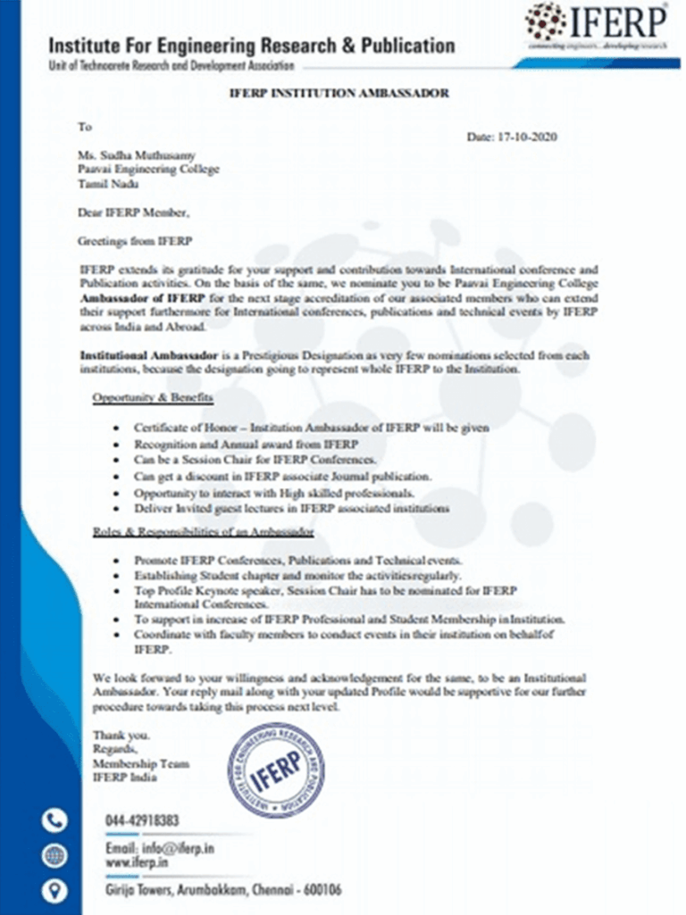 M.Sudha, Professor & Head, ECE has nominated as “INSTITUTION AMBASSADOR” of IFERP for her support and contribution towards International conferences and Publication activities, by the Institute For Engineering Research & Publication, India on 17th Oct 2020.