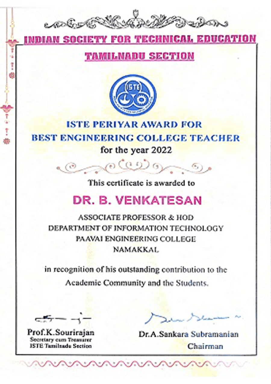 Dr. B. Venkatesan, HoD/IT, has received the ‘ISTE Periyar Award for Best Engineering College Teacher for the Year 2022’ from the Indian Society for Technical Education (ISTE), Tamil Nadu Section, for his outstanding contribution to the academic community and the students