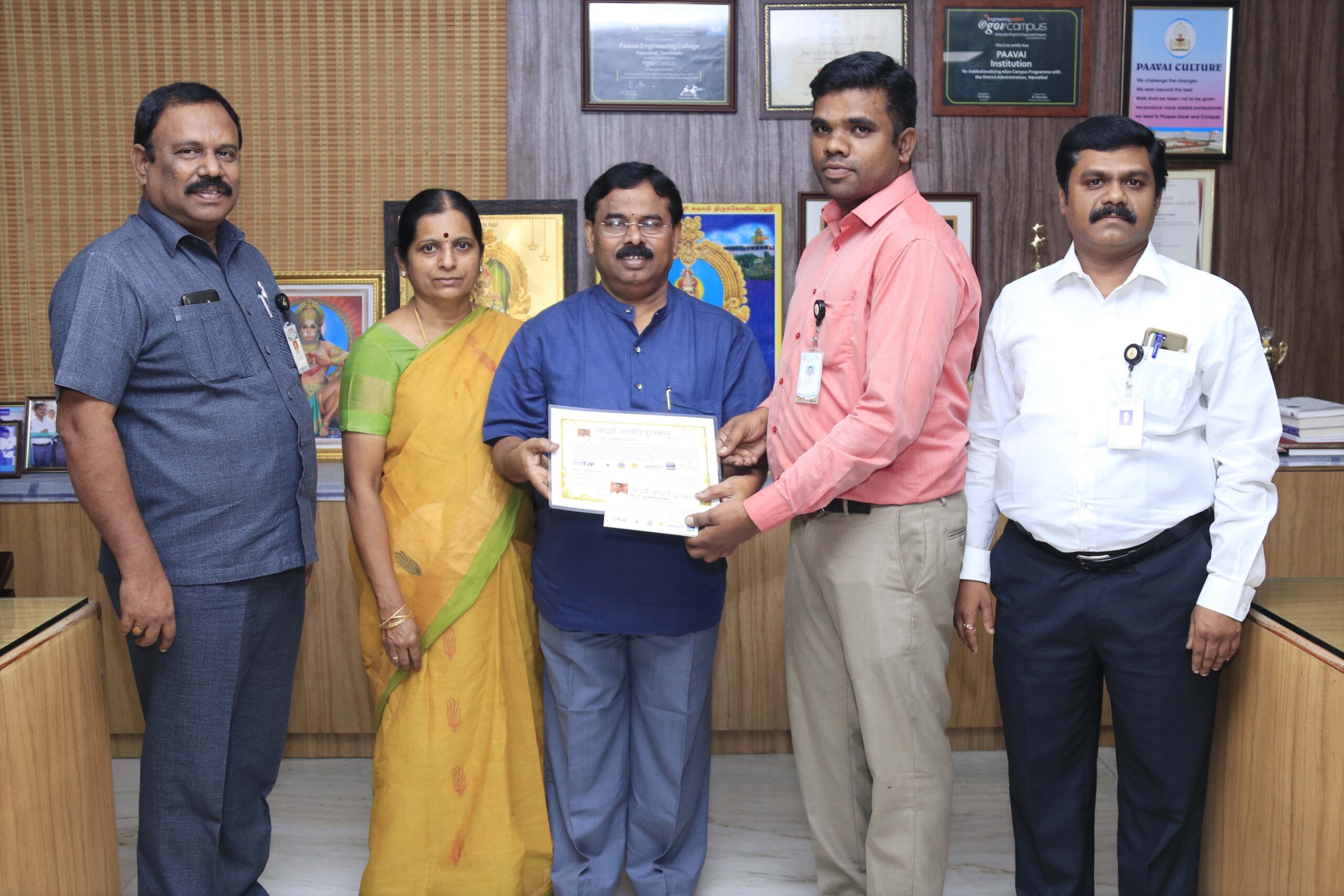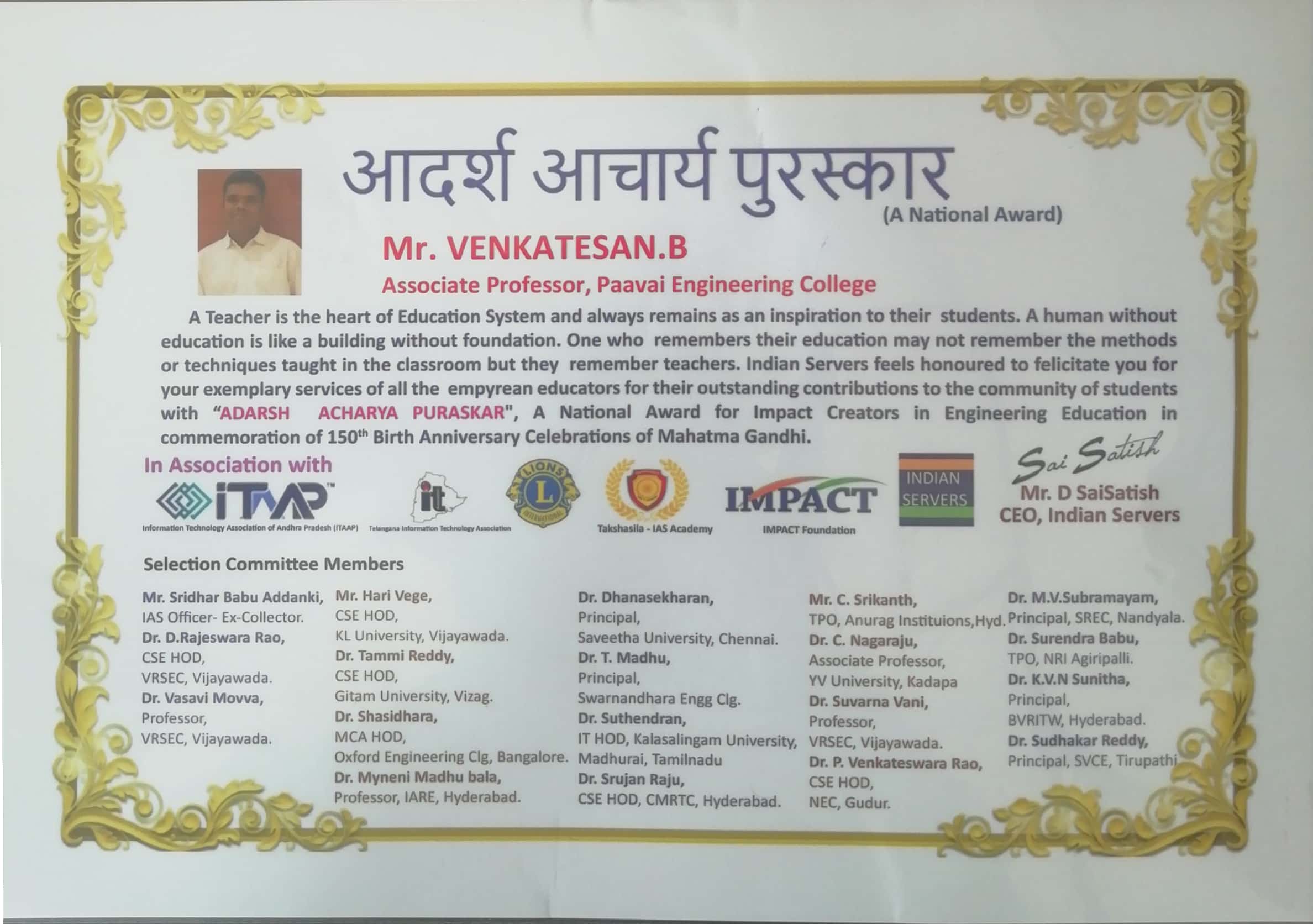 Mr B.Venkatesan, Head of Information Technology, Paavai Engineering College. He had received his prestigious National award from Information Technology association of Andhra Pradesh & Telangana and Indian Servers as ” Adarsh Acharya Puraskar ” for impact creators in Engineering Education in commoration of 150th Birth Anniversary Celebrations of Mahatma Gandhi.