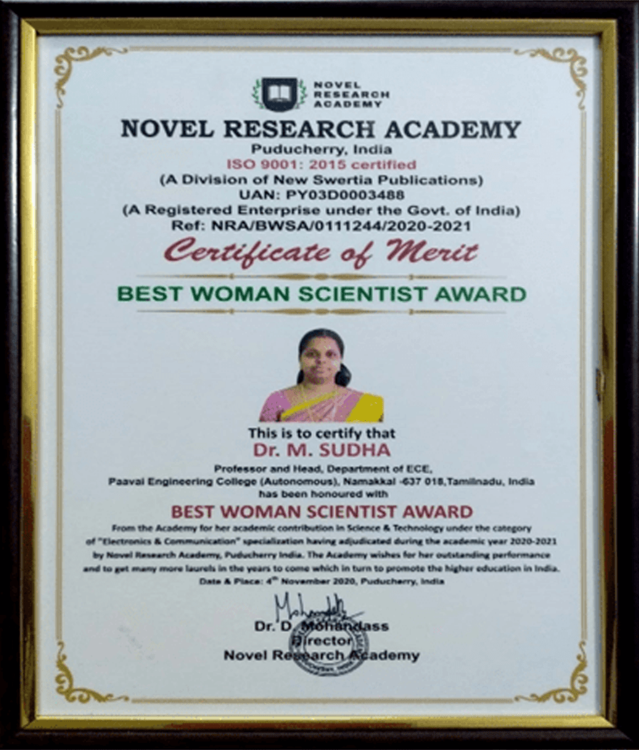 M.Sudha, Professor & Head, ECE has received “BEST WOMEN SCIENTIST AWARD” for her academic contribution under science & Technology under the category of Electronics & Communication specialization having adjudicated during the academic year 2020-2021, from Novel Research Academy, Puducherry on 04th Nov 2020.
