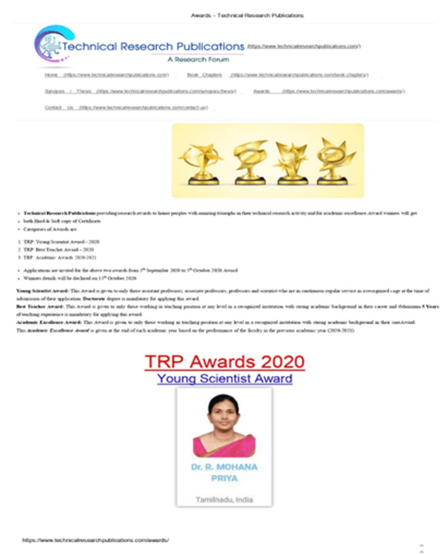 R.Mohanapriya, ASP, ECE has received “YOUNG SCIENTIST AWARD” for the continuous research publication, from the Technical Research Publications on 15th Oct 2020.