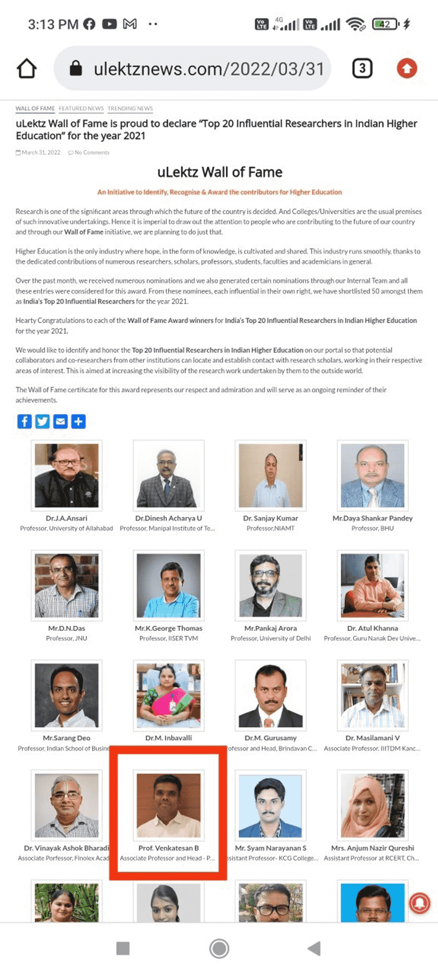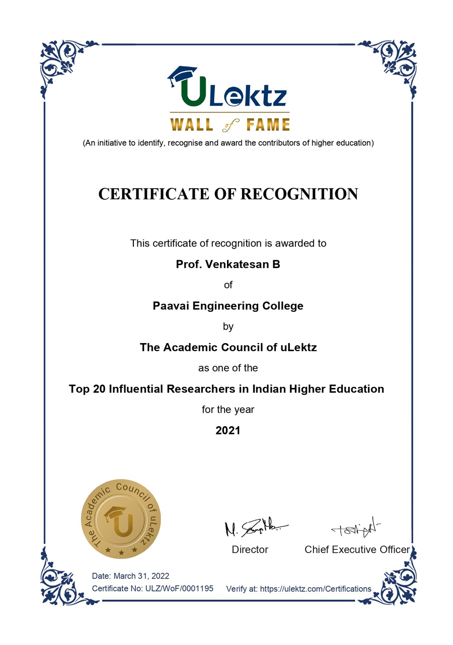 B Venkatesan , HoD/IT have been recognized as “Top 20 Influential Researchers in Indian Higher Education for the year 2021” by The Academic Council of uLektz