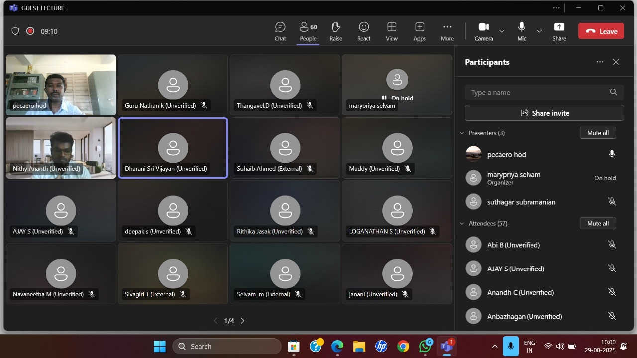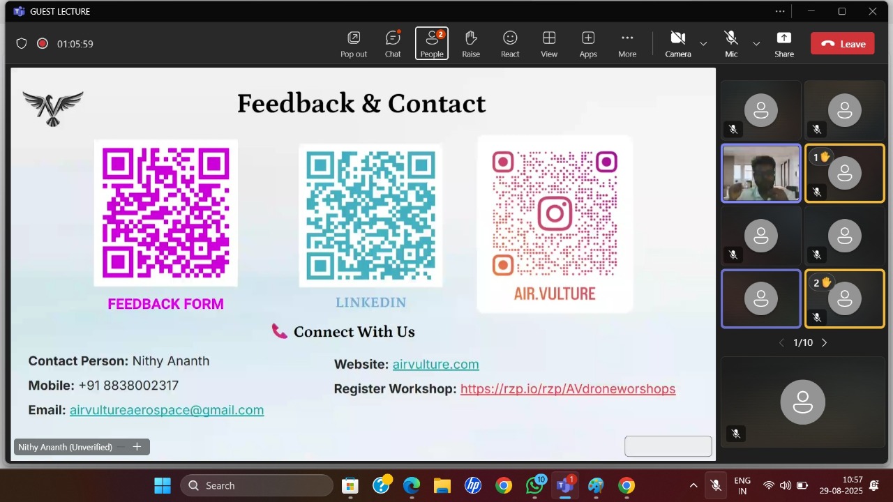 The Department of Aeronautical Engineering, Paavai Engineering College, organized an Online Guest Lecture on “Artificial Intelligence in Autonomous Flight Robotics” on 29th August 2025. The event was conducted under the banner of the Institution’s Innovation Council (IIC) to provide students with insights into the latest advancements in artificial intelligence and its applications in autonomous flight systems.