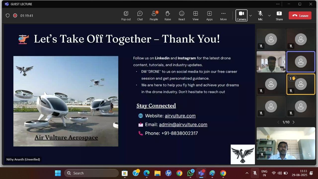 The guest lecture was delivered by Mr. K. Nithy Ananth, Founder and CEO of Air Vulture Aerospace OPC Pvt. Ltd., Kumarasamypatti, Salem.