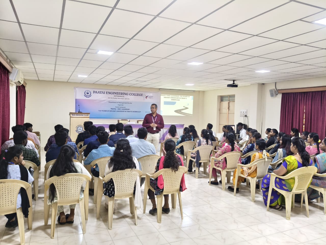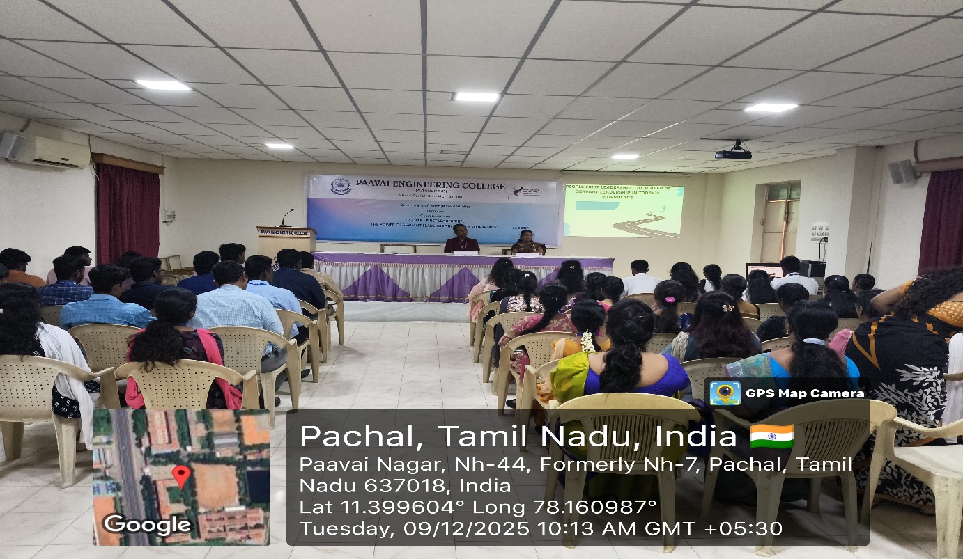The Department of Management Studies, Paavai Engineering College (Autonomous), organized a guest lecture on 09.12.2025 titled “People–First Leadership: The Power of Servant Leadership in Today’s Workplace” at Cute Hall, Paavai Engineering College, Namakkal.