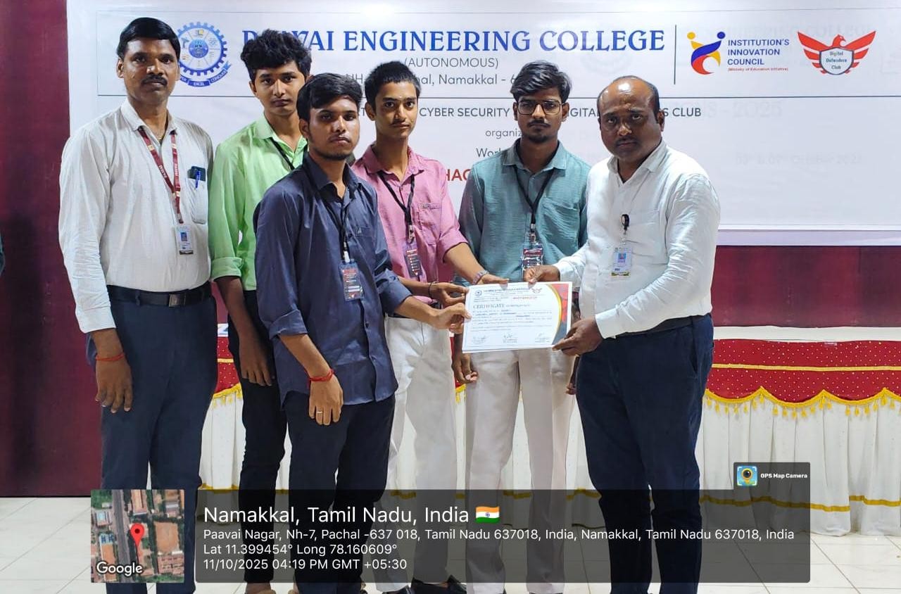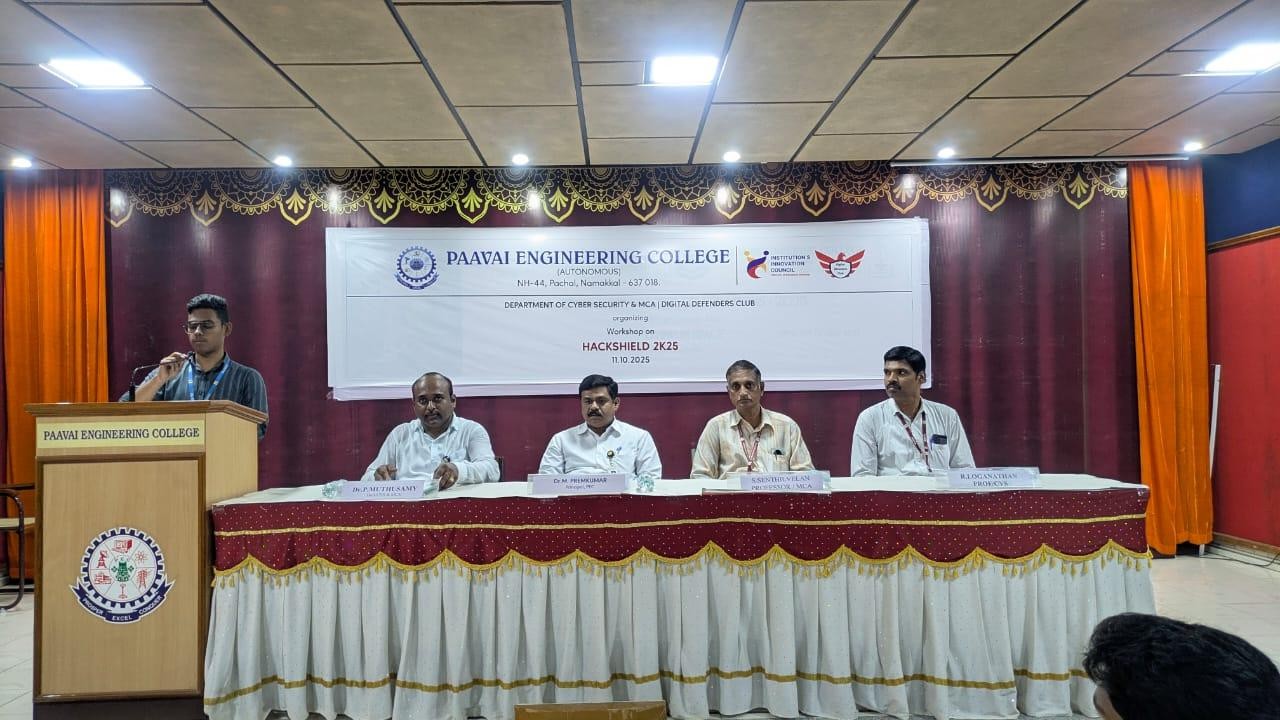 The workshop commenced with a welcome address delivered by A. Ajmal Thahseen, IV year Cyber Security student, followed by the presidential address by Dr. P. Prem Kumar, Principal of Paavai Engineering College. Dr. P. Muthusamy, Head of the Department, then delivered a prelude to the event, outlining its objectives and significance.