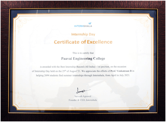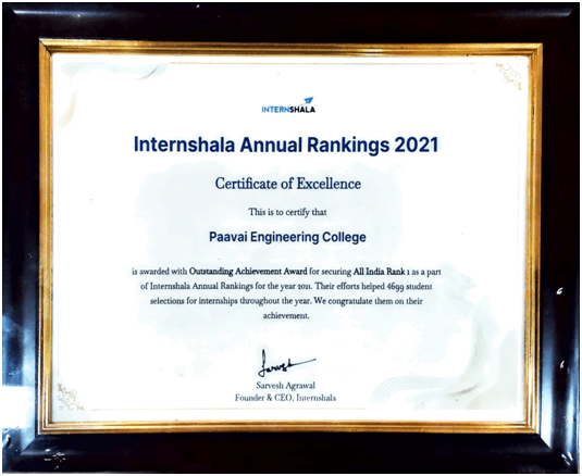 Paavai Engineering College has received All India level First Rank – Best Internship Record during Internship day on 25.8.2021 jointly organised by AICTE and Internshala and it was awarded by Prof. Anil Sahasrabudhe, Chairman, AICTE, New Delhi. Paavai Engineering College has received outstanding achievement award for securing All India Rank 1 for the academic year 2021.