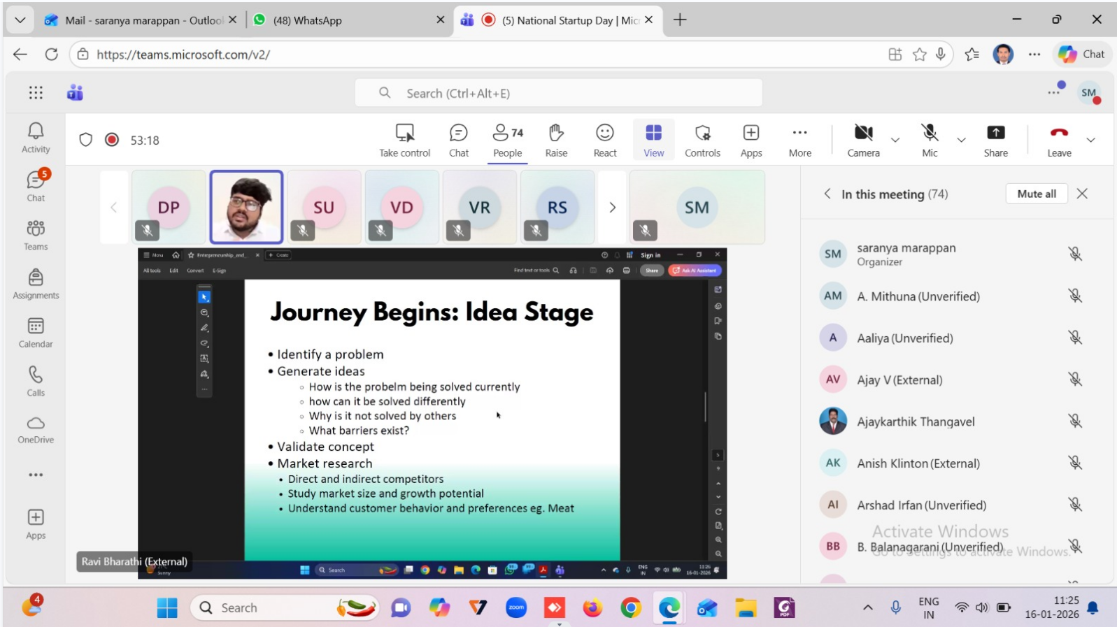 The Institution’s Innovation Council in association with the Entrepreneurship Development Cell have celebrated the importance of National Startup Day 2026’ with a webinar titled “From Entrepreneurship to Startups and it’s strategies” on 16.01.2026. It was aimed to promote the awareness about entrepreneurship and contribution of start-ups in the growing Indian economy. The welcome address and the Chief guest introduction was given by Ms.Sharmi, I Year / MBA. Dr.M.PremKumar, President IIC gave the presidential address where he addressed about start-up ecosystem and the initiatives.