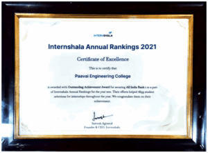 Paavai Engineering College has received All India level First Rank – Best Internship Record during Internship day on 25.8.2021 jointly organised by AICTE and Internshala and it was awarded by Prof. Anil Sahasrabudhe, Chairman, AICTE, New Delhi. Paavai Engineering College has received outstanding achievement award for securing All India Rank 1 for the academic year 2021.