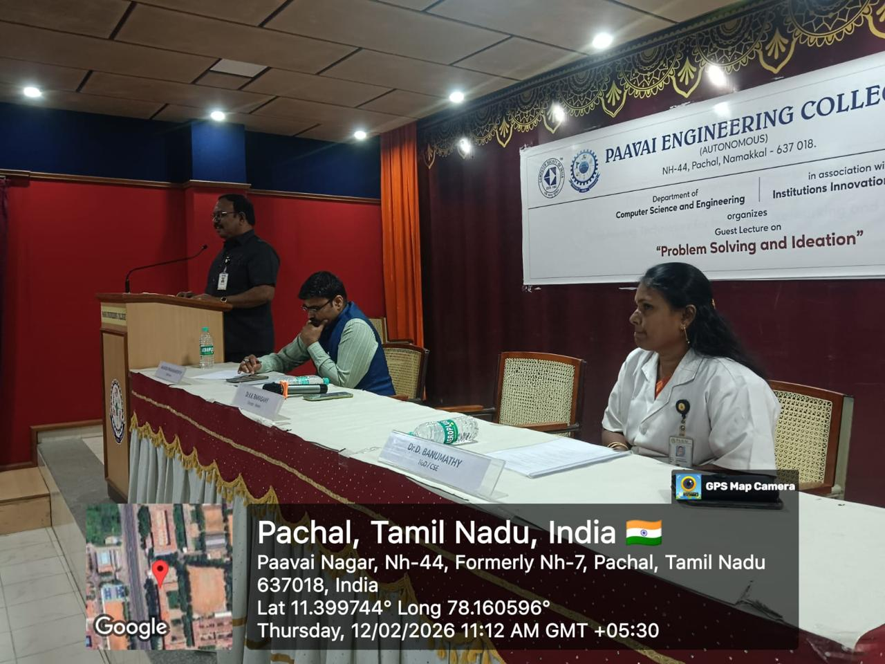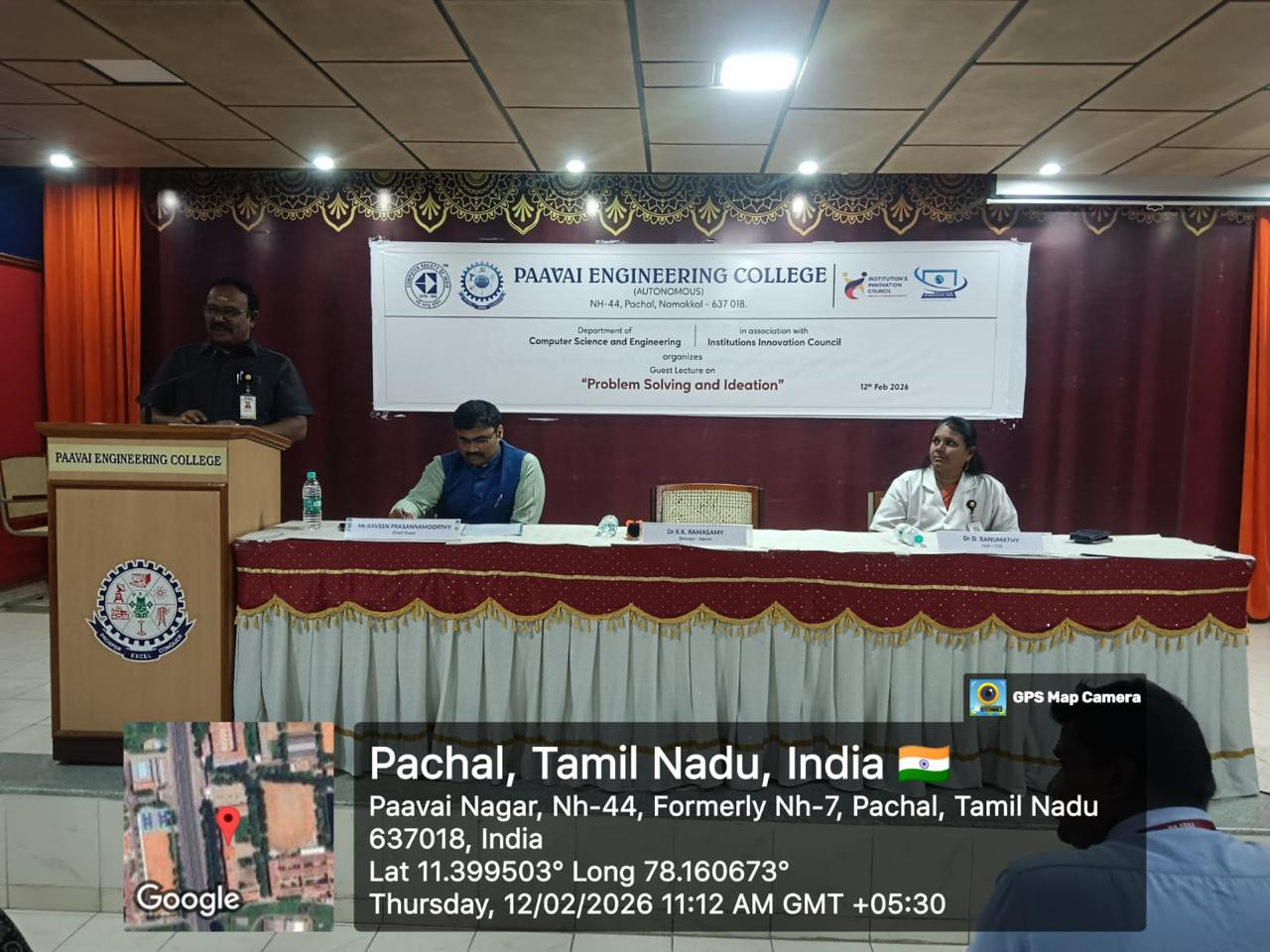 The Department of Computer Science and Engineering of Paavai Engineering College, in association with the Institution’s Innovation Council (IIC), Computer Society of India (CSI), and the Software Development & Information Management Club, organized a Guest Lecture on “Problem Solving and Ideation for Startup & Entrepreneur” on 12.02.2026 at Kalam’s Chamber. The objective of the session was to create awareness among students about entrepreneurship, innovative thinking, and real-world problem solving. It aimed to develop students’ ideation skills and encourage them to identify practical solutions to everyday challenges.