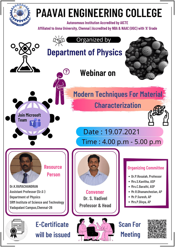 The department is actively engaged in research activities in the areas of thin films and Materials Science. Department has got well-established laboratory to provide good hand on experience of physics experiments to students. Also, department has research laboratory with facilities developed to carry out research in the field of Crystal Growth, Thin film, Material Science, Ultrasonics and Spectroscopy. The Department has established a research laboratory and has been recognized as the approved research centre by Anna University, Chennai for doing research. Two faculty members have recognition as Research Guide in Physics by Anna University, Chennai, Tamil Nadu, India.