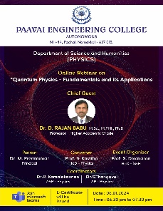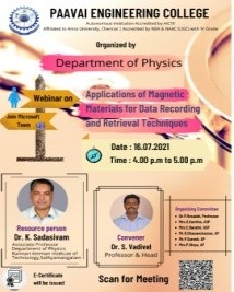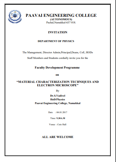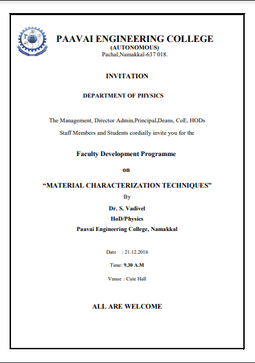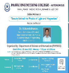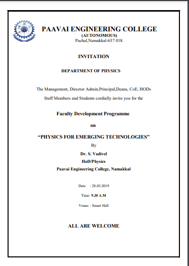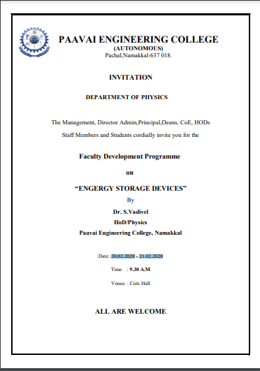 Physics department was established in the year 2001. The Physics department has enthusiastic, academically experienced and research oriented faculties. The department aims at equipping the future engineers with various aspects of fundamental physics, which make them understand, develop and innovate, thus contributing to the technological development of tomorrow. As of now, the Department has active teaching and research programmes with faculty strength of 13. The faculty of Physics Department has been actively pursuing research in important areas like Crystal Growth, Thin film, Material Science, Ultrasonic and Spectroscopy. The Department has 3 Ph.D research scholars and five members who have completed Ph.D through our department. The faculty members have published more than 35 papers in reputed National / International journals and presented a number of papers in National/ International Conferences.