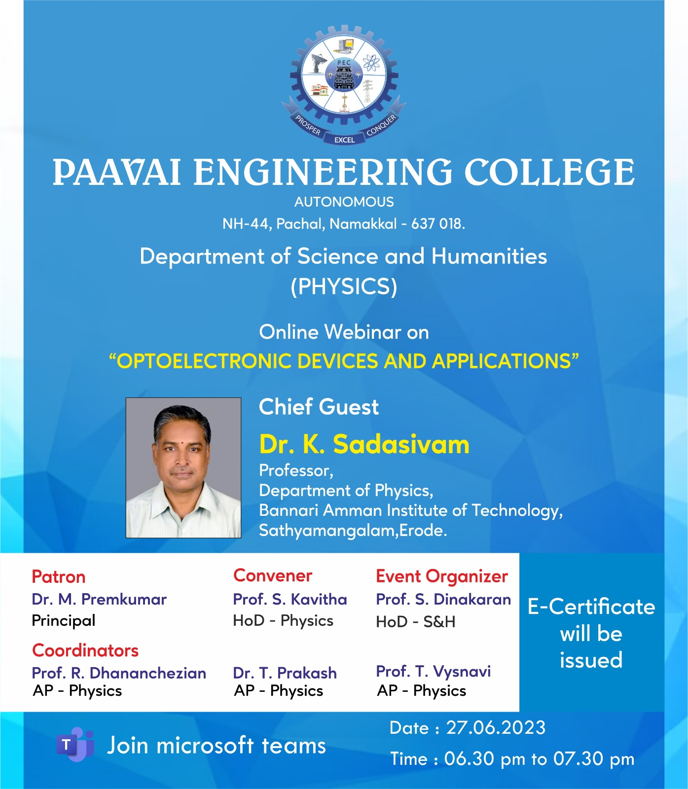 Dr. T. Krishnakumar is currently working as a Professor and Head of the Department of Physics at Paavai Engineering College(Autonomous) in Pachal, Namakkal, Tamil Nadu. He earned his Bachelor’s degree and Master’s degree in Physics from Periyar University, Salem. He was awarded a Doctor of Philosophy (Ph.D.) in Physics with a specialization in nanomaterials at Bharathiyar University, Coimbatore. He took up his academic pursuits with more than 19 years of experience in the field of Teaching & Research. He has active research collaborations in reputed research institutes in India and foreign countries.