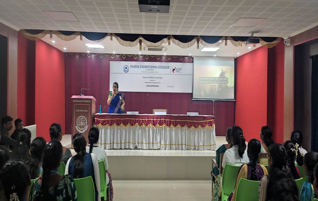 Women Welfare Committee of Paavai Engineering College organized a one-day seminar titled ‘Awareness on OSTEOPOROSIS’ on 4th February 2025 at Tata Hall, with the primary objective of creating awareness among students about the bone health and preventive care. The session aimed to educate participants about osteoporosis, a condition that weakens bones and increases the risk of fractures.