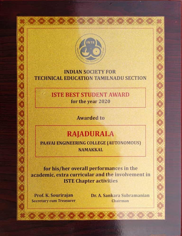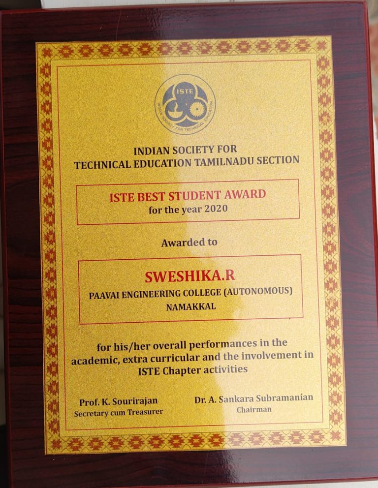 A.Rajadurai (2017-2021) from IT department and R.Sweshika(2017-2021) from ECE Department have received” ISTE Best Student Award for the year 2020” for their overall performances in the academic ,extra curricula rand the involvement in ISTE Chapter activities.