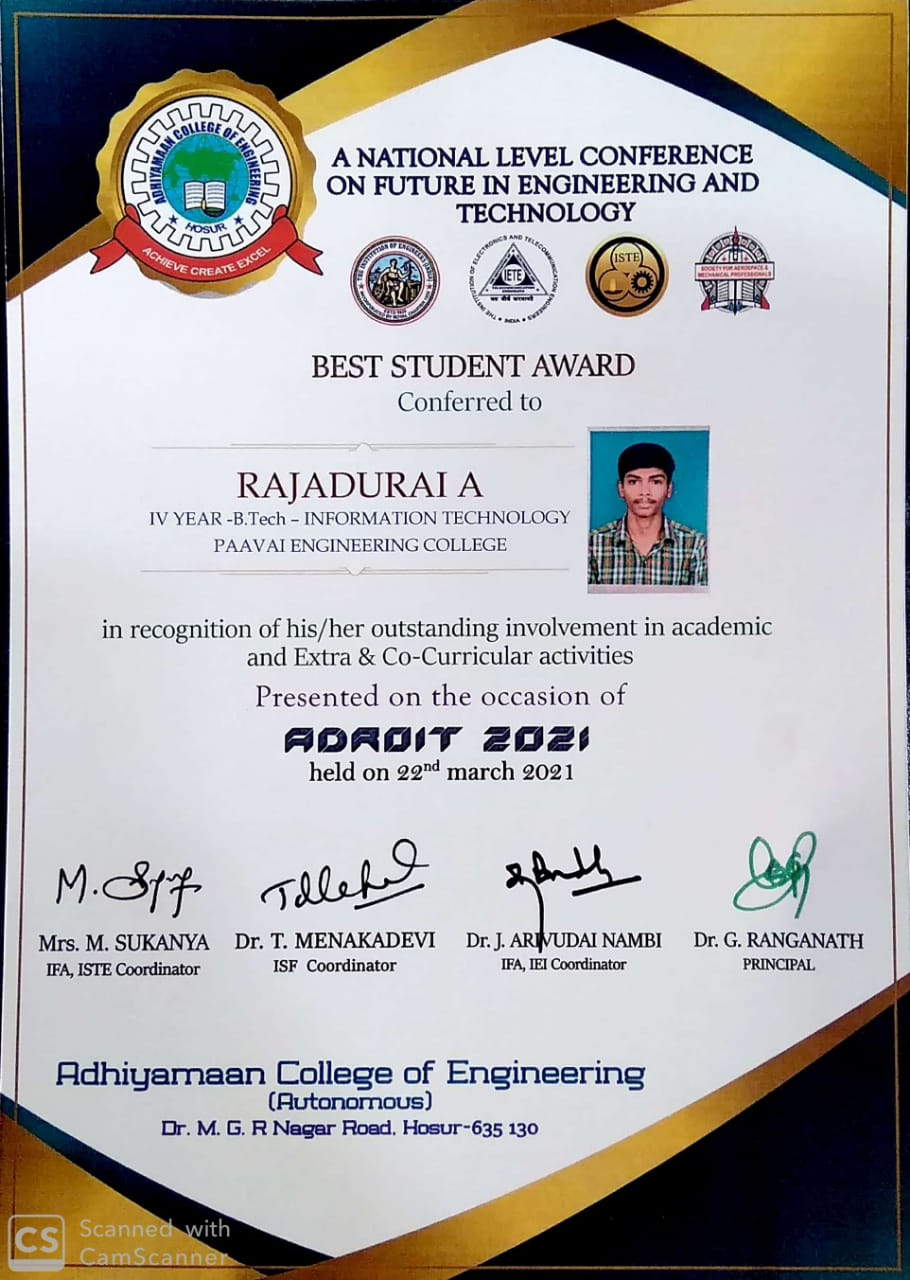 A.Rajadurai (2017-2021) from IT Department, has received Best Student Award in recognition of his outstanding involvement in academic and Extra & Co-Curricular activities presented on “A National Level Conference on Future in Engineering and Technology” in association with ISTE,IEI,IFA and ISF held on 22nd March 2021 at Adhiyaman College of Engineering, Hosur.