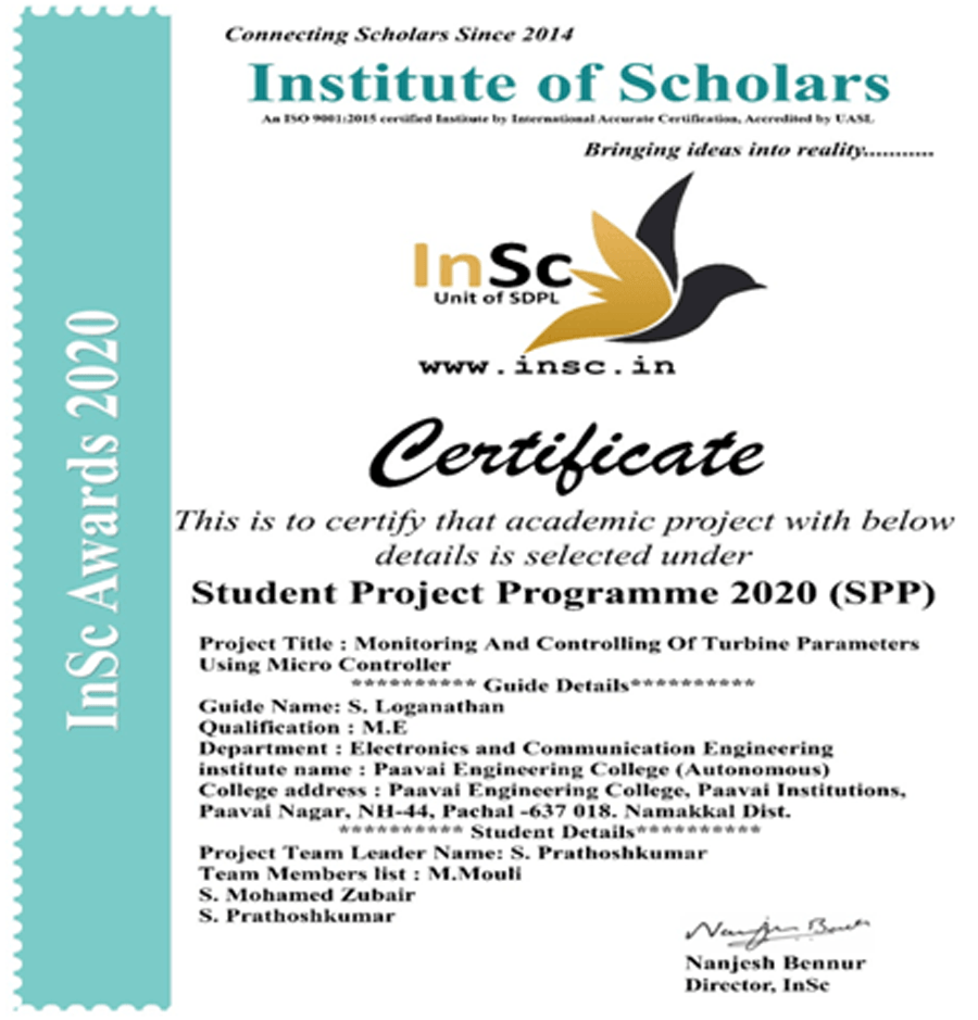 The following students has got selected for the “Best student project of the year” award in Insc awards 2020. Project tittled on “Monitoring and Controlling of Tubine Parameters Using Microcontroller”.
