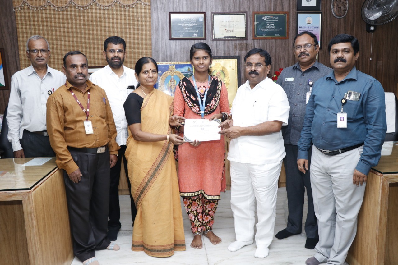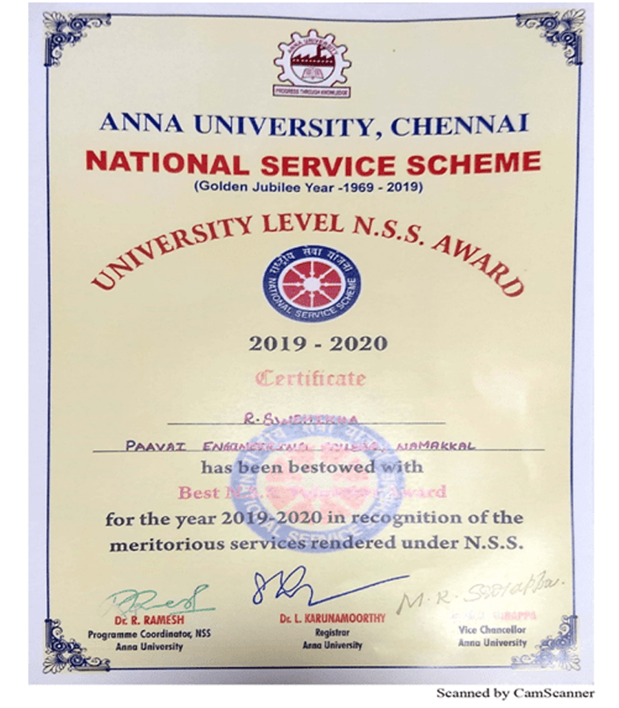 National Service Scheme (NSS) Anna University, Chennai appreciates all the affiliated engineering colleges in Tamil Nadu for their NSS activities and gives the award every year. The NSS award function for the year 2018-19 was conducted on 15.10.2019 was presided by Dr.K.K.Surappa, Vice Chancellor, Anna University, Chennai. Paavai Engineering College volunteer Ms.M.Subasri, Final Year, B.E. (Agriculture Engineering) received the for best NSS Volunteer Award among the 36 NSS Volunteers shortlisted at the Tamil Nadu State Level for the year 2018-19.