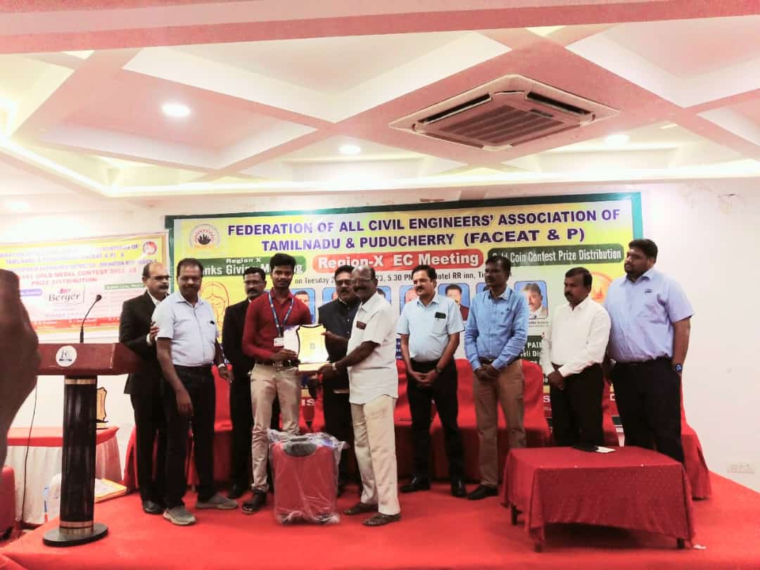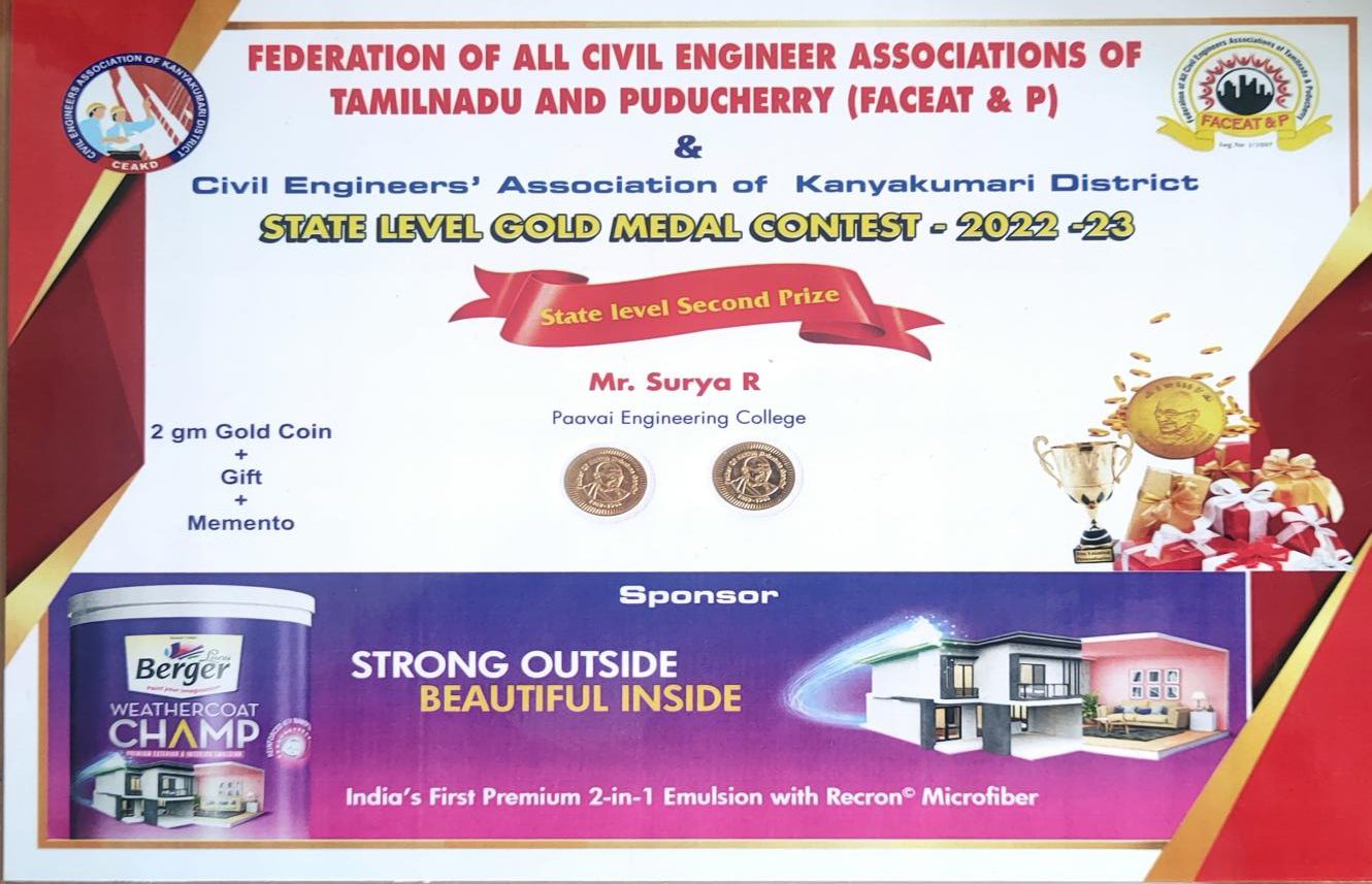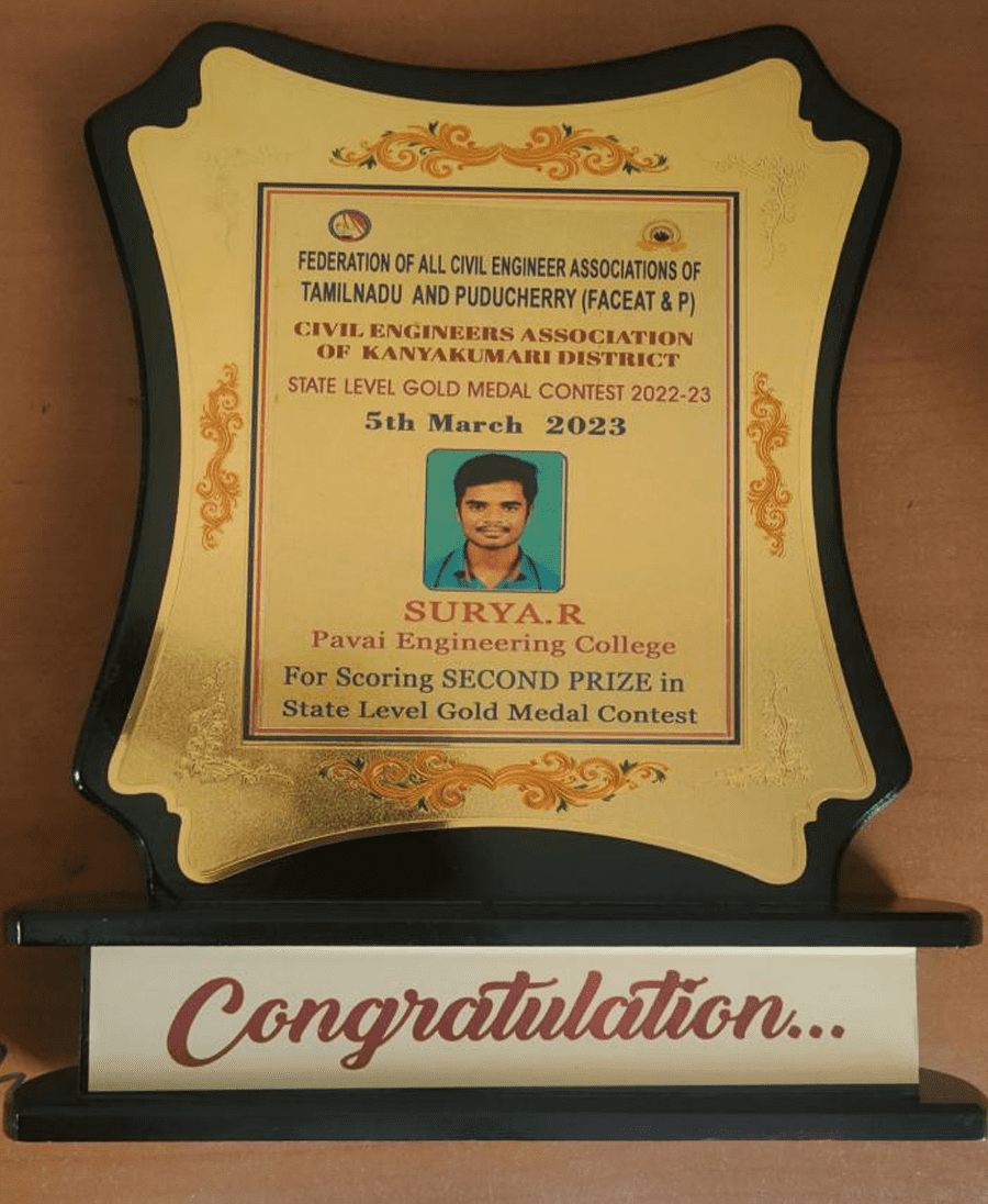Mr.R.Surya, final year student of Civil Engineering has secured state level 2nd prize in Gold Medal Contest 2022-2023 organized by the Federation of all Civil Engineers Associations of Tamil Nadu and Puducherry (FACEAT & P). He has been awarded with 2 gram gold coin with a shield on 28.03.2023 at Tirunelveli. Out of 89 Final participants from all over Tamil Nadu were selected for Final round, among that, our student Mr.R.Surya has secured 2nd place at State Level.