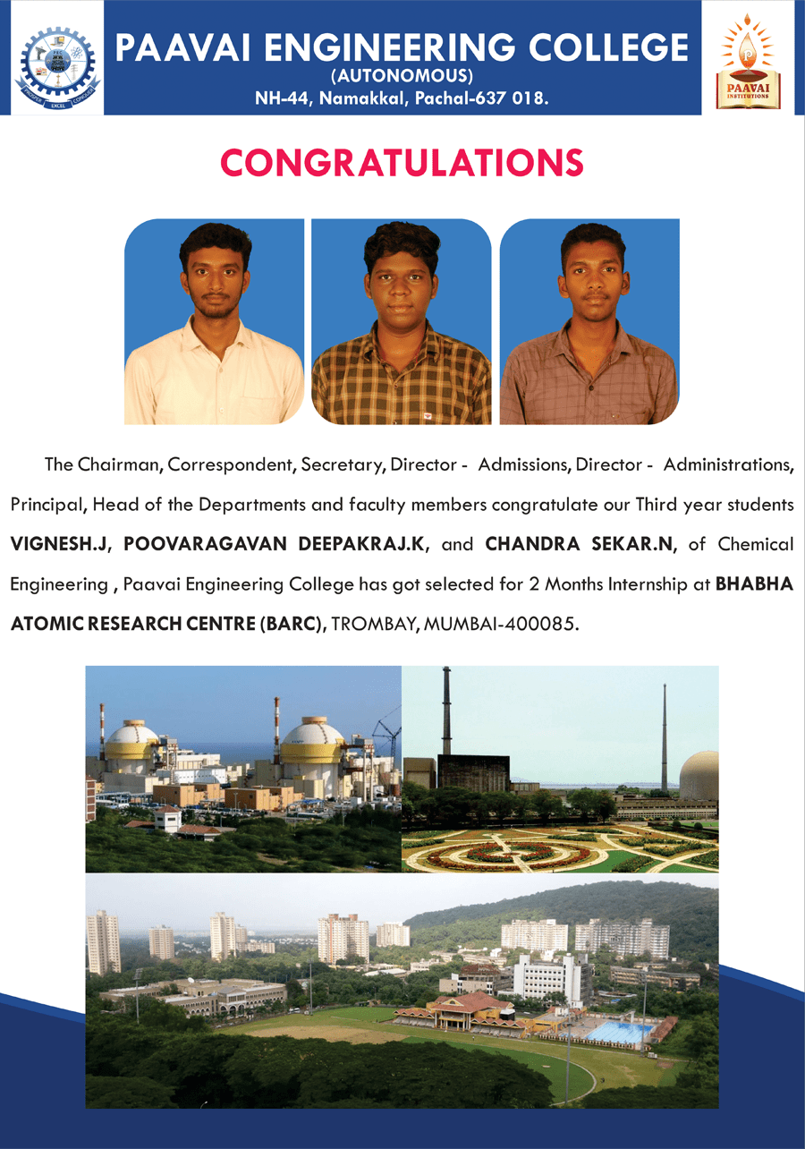 Our Chemical Engineering students got Two months Internship in Bhabha Atomic Research Center :