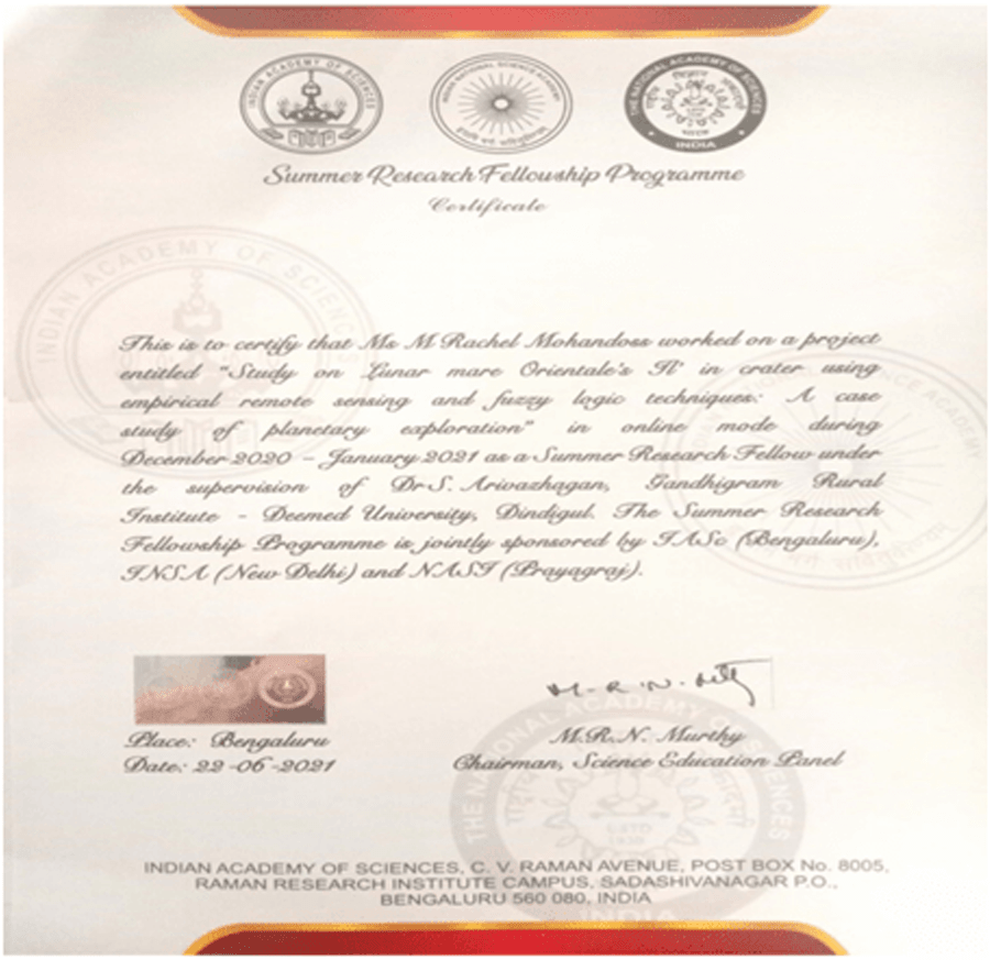 M.Rachel from final year ECE has successfully completed her “SUMMER RESEARCH FELLOWSHIP” sponsored by Indian Academy of Sciences (IASc), Banglore, Indian National Science Academy(INSA) New Delhi ,The National Academy of Sciences, India(NASI). She worked on project entitled “Study on lunar mare orientale’s in crater using empirical remote sensing and fuzzy logic techniques: A case study of Planetary exploration” in online mode during December 2020 – January 2021